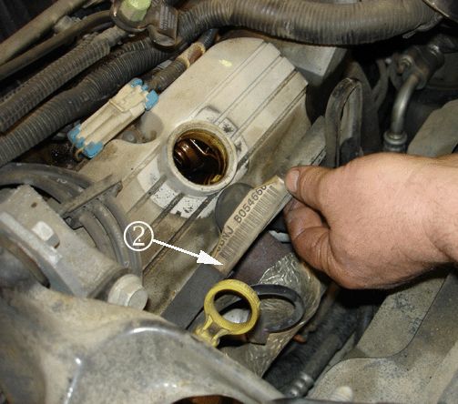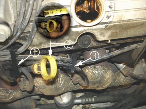 5. Install a 7mm two-wire retainer, P/N 12132229 (qty 10/pack) to spark plug wires 3 and 5 only (3). Save the other 7mm spark plug two-wire retainers for future repairs. Make sure the spark plug retainer (3) is approximately 50mm (2 in) from the oil level indicator (2).