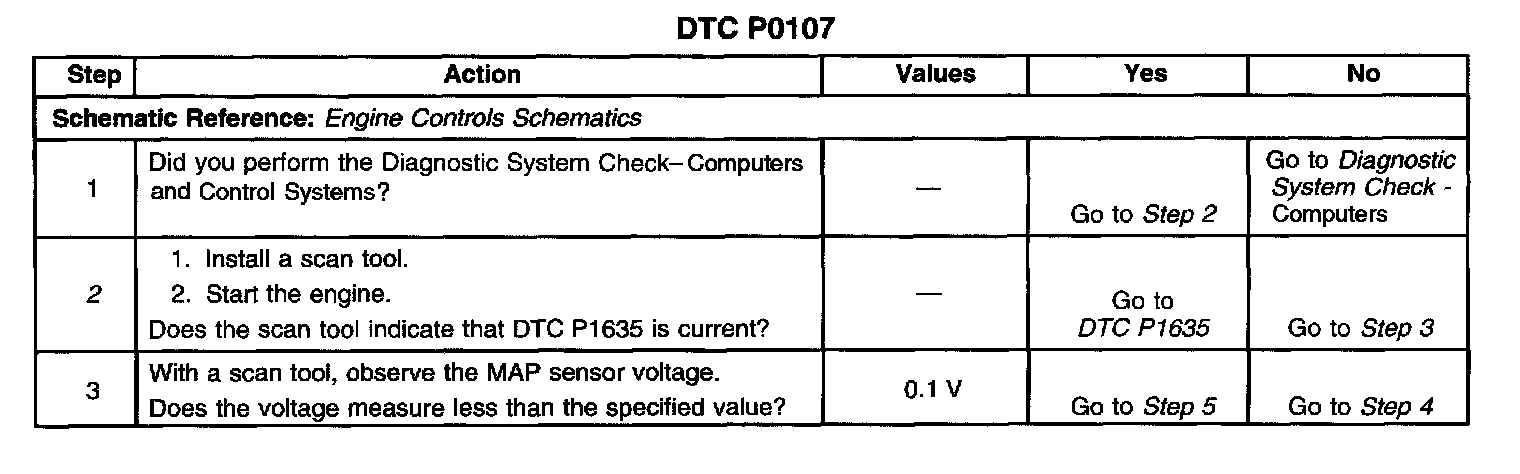 2. The MAP sensor 5 volt reference circuit is shared with other sensors. If DTC P1635 is set, this indicates that the 5 volt reference circuit is either shorted to ground or shorted to voltage and should be diagnosed first. The short may be on another sensor 5 volt reference circuit.
