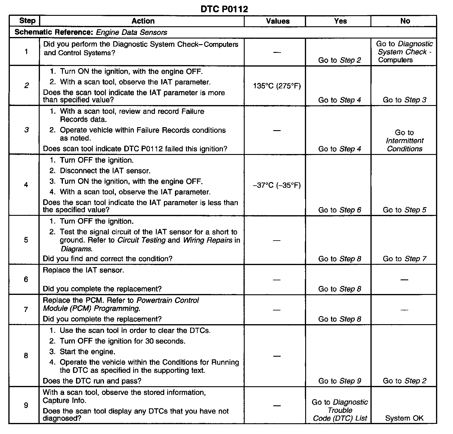 3. If DTC P0112 can be repeated only by duplicating the Failure Records conditions. Refer to the Temperature vs Resistance table. [1][2]Computers and Control Systems The table may be used to test the IAT sensor at various temperatures in order to evaluate the possibility of a shifted sensor that may be shorted above or below a certain temperature. If this is the case, replace the IAT sensor. If the IAT sensor appears to be OK, the fault is intermittent.
