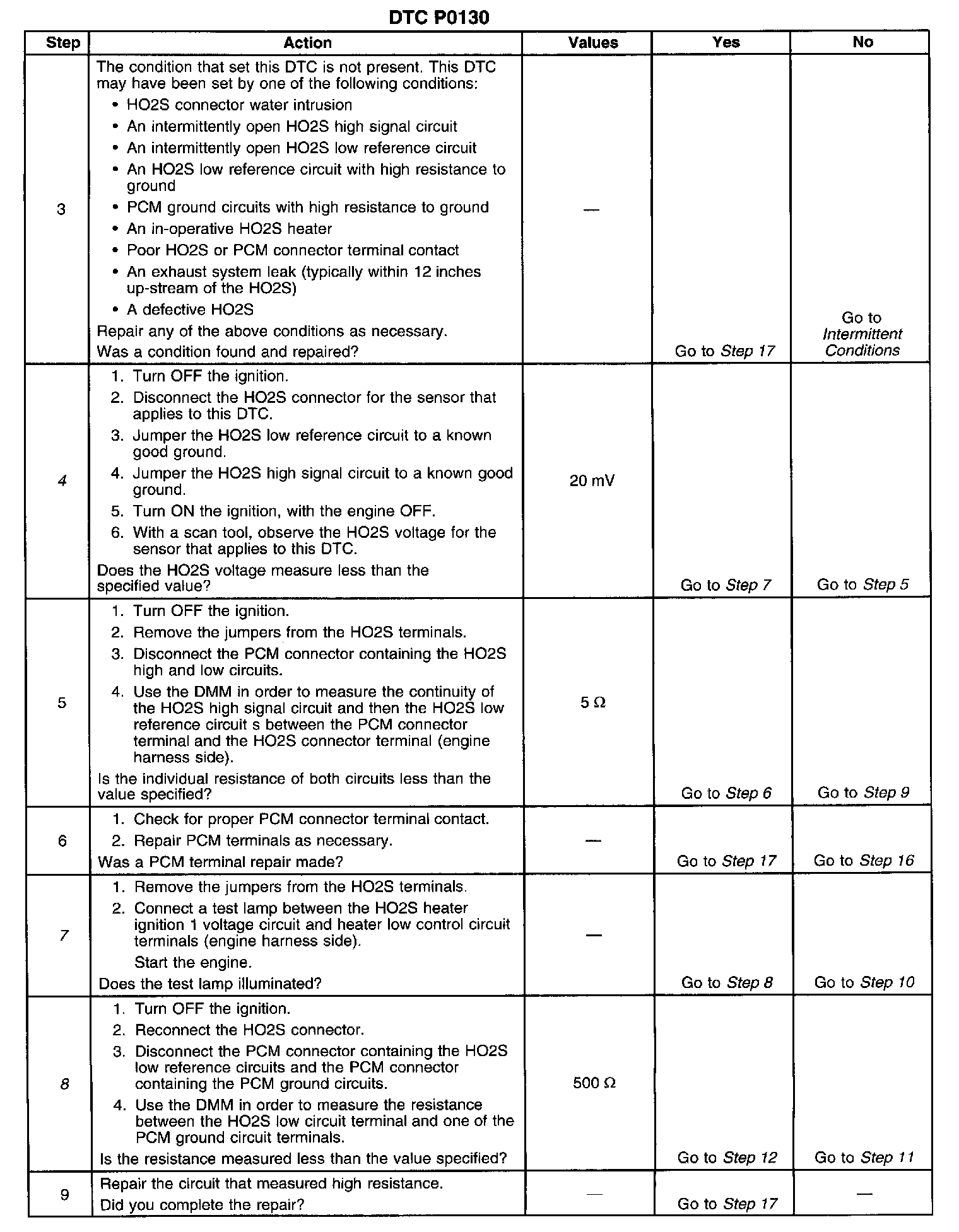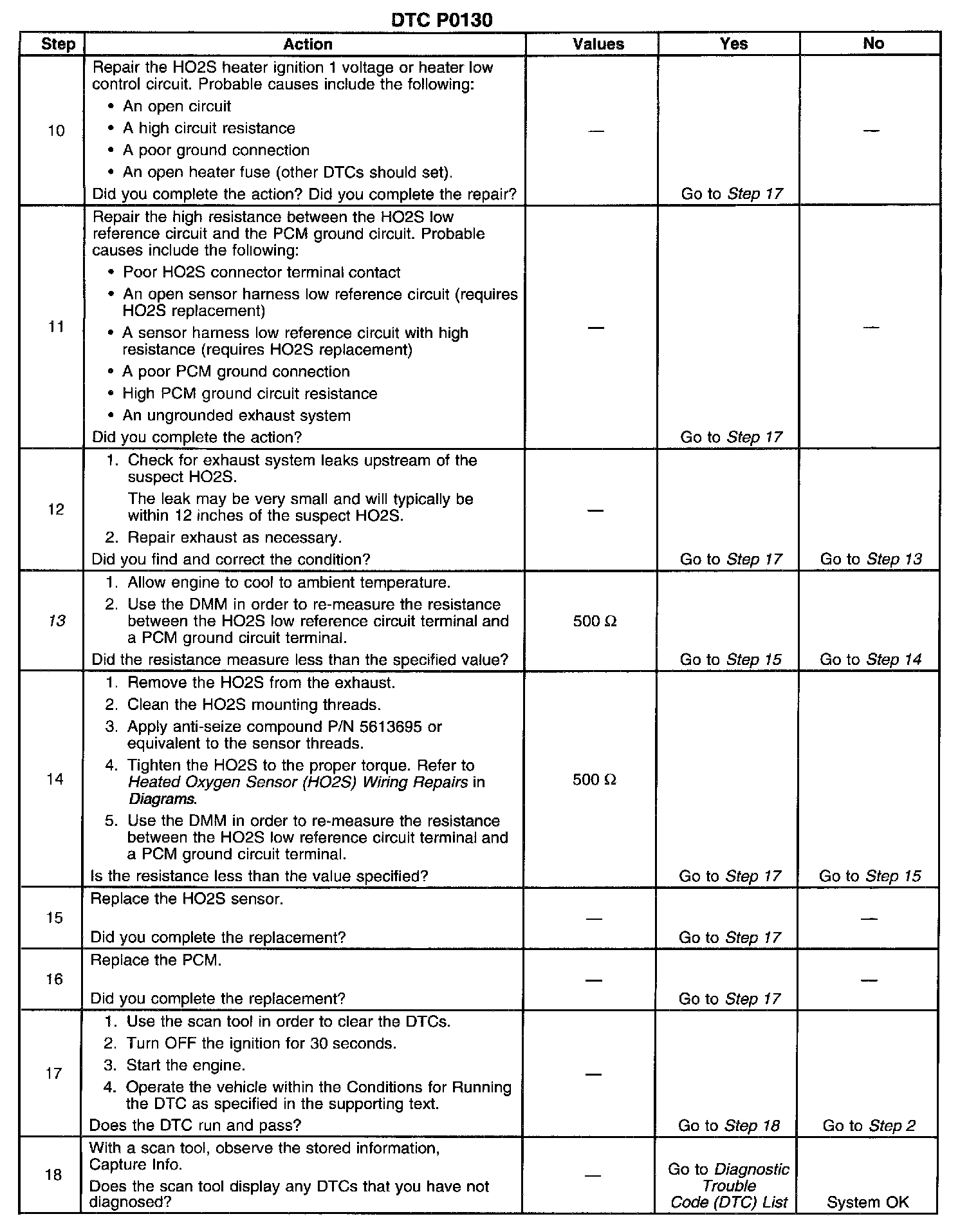 13. This step checks for proper circuit resistance between the HO2S low reference circuit and PCM ground with a COLD sensor. A loose HO2S or poor thread to exhaust electrical contact will cause higher resistance when the HO2S is cold. Although 500 ohms is allowed, typical resistance should be less than 50 ohms.