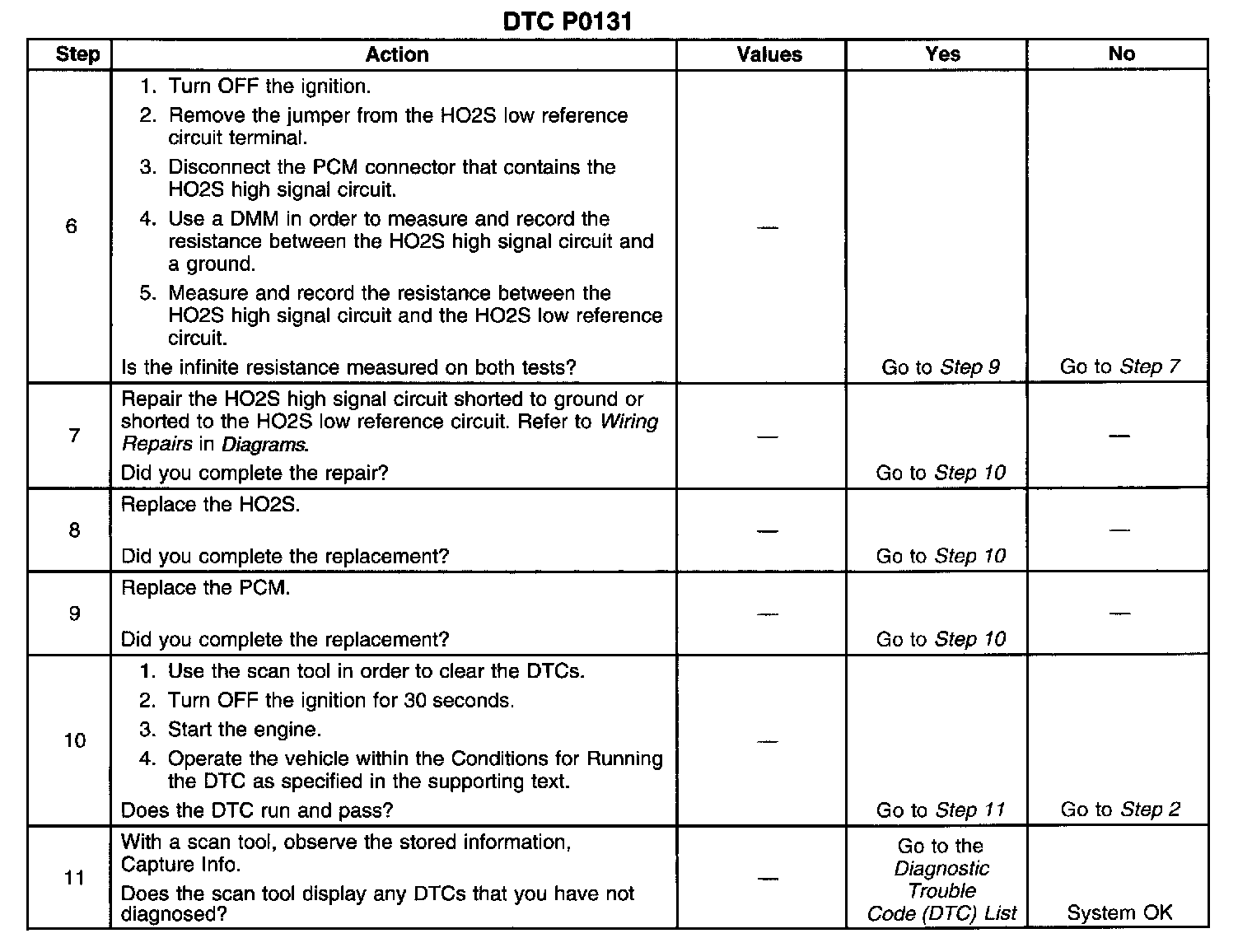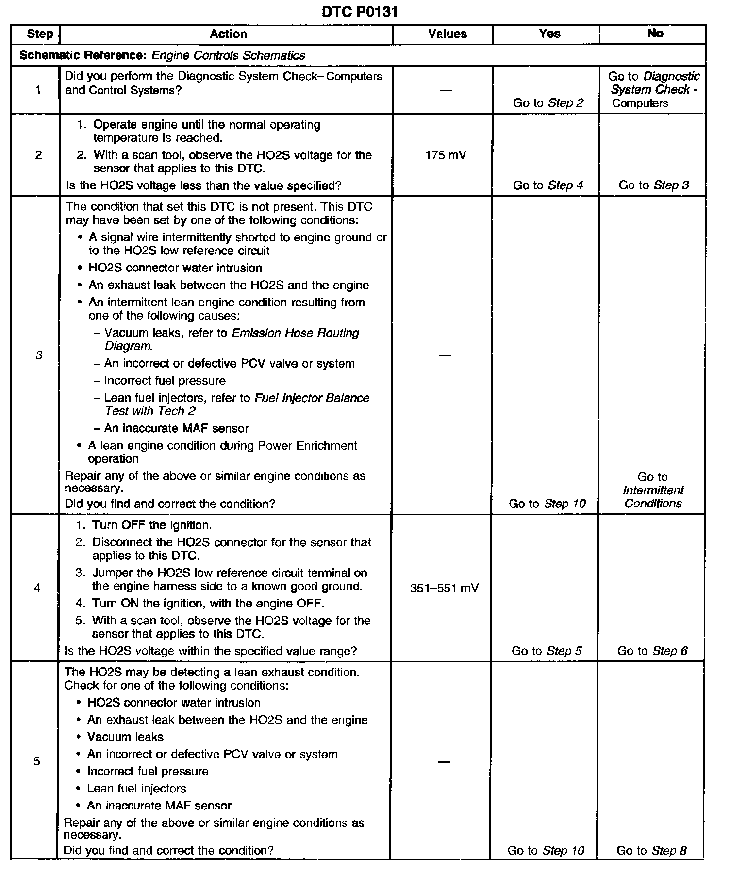 CIRCUIT DESCRIPTIONThe Powertrain Control Module (PCM) supplies a bias voltage of approximately 450 mV between the Heated Oxygen Sensor (HO2S) signal and the low circuits. When measured with a 10-megaohm DMM, this may display as low as 350 mV. The oxygen sensor varies the voltage from approximately 1000 mV when the exhaust is rich, to approximately 100 mV when exhaust is lean. The PCM constantly monitors the HO2S signal during closed loop operation and compensates for a rich or lean condition by decreasing or increasing the injector pulse width as necessary. If the HO2S 1 voltage remains excessively low for an extended time, DTC P0131 will set.