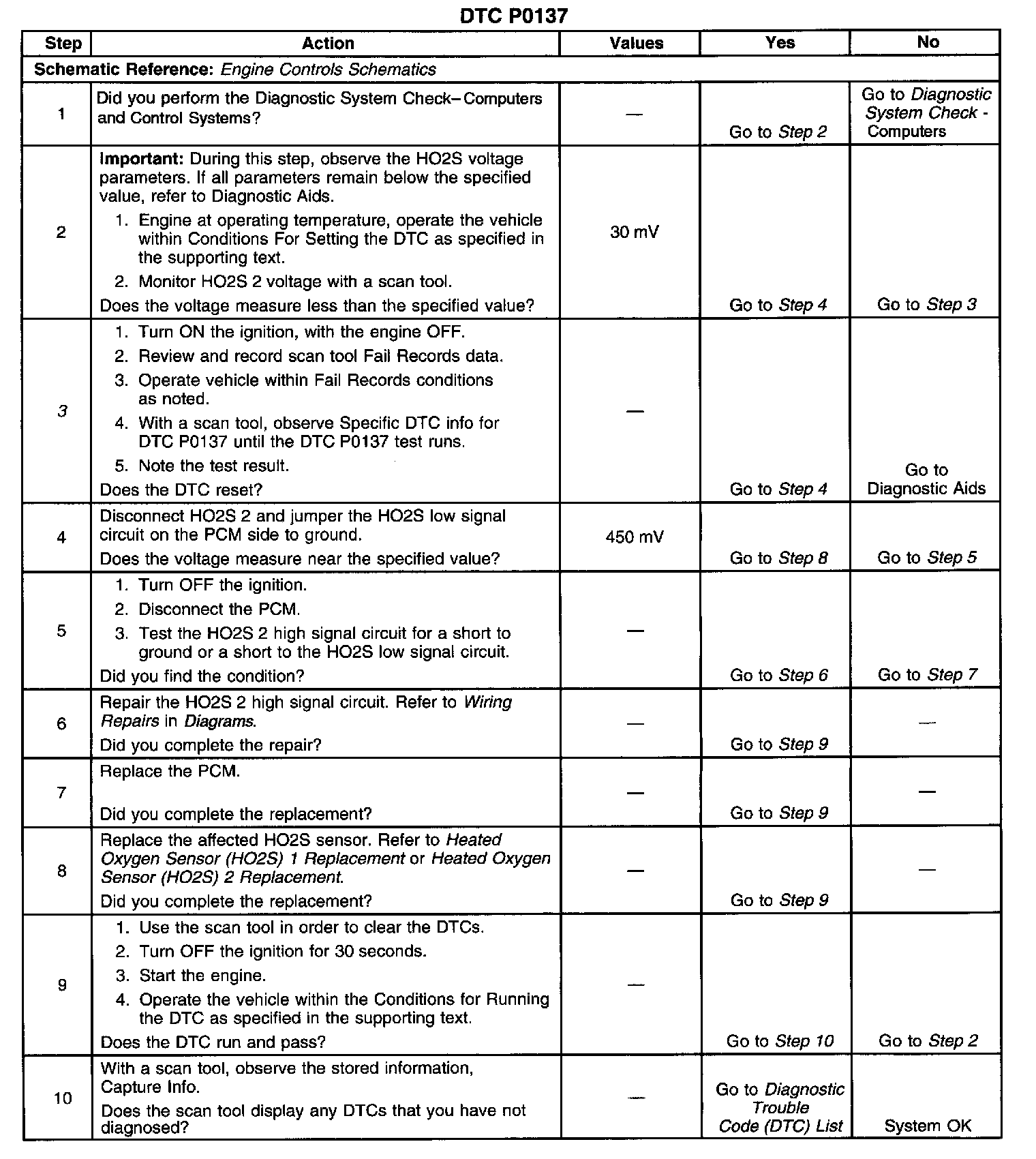 CIRCUIT DESCRIPTIONTo control emissions of Hydrocarbons (HC), Carbon Monoxide (CO), and Oxides Of Nitrogen (NOx), a three-way catalytic converter is used. The catalyst within the converter promotes a chemical reaction which oxidizes the HC and CO present in the exhaust gas, converting them into harmless water vapor and carbon dioxide. The catalyst also reduces NOx, converting it to nitrogen. The PCM has the ability to monitor this process using the HO2S 1 and the HO2S 2 heated oxygen sensors. The HO2S 1 sensor produces an output signal which indicates the amount of oxygen present in the exhaust gas entering the three-way catalytic converter. The HO2S 2 sensor produces an output signal which indicates the oxygen storage capacity of the catalyst; this in turn indicates the catalysts ability to convert exhaust gases efficiently. If the catalyst is operating efficiently, the HO2S 1 signal will be far more active than that produced by the HO2S 2 sensor. If the HO2S 2 signal voltage remains excessively low for an extended period of time, DTC P0137 will set.