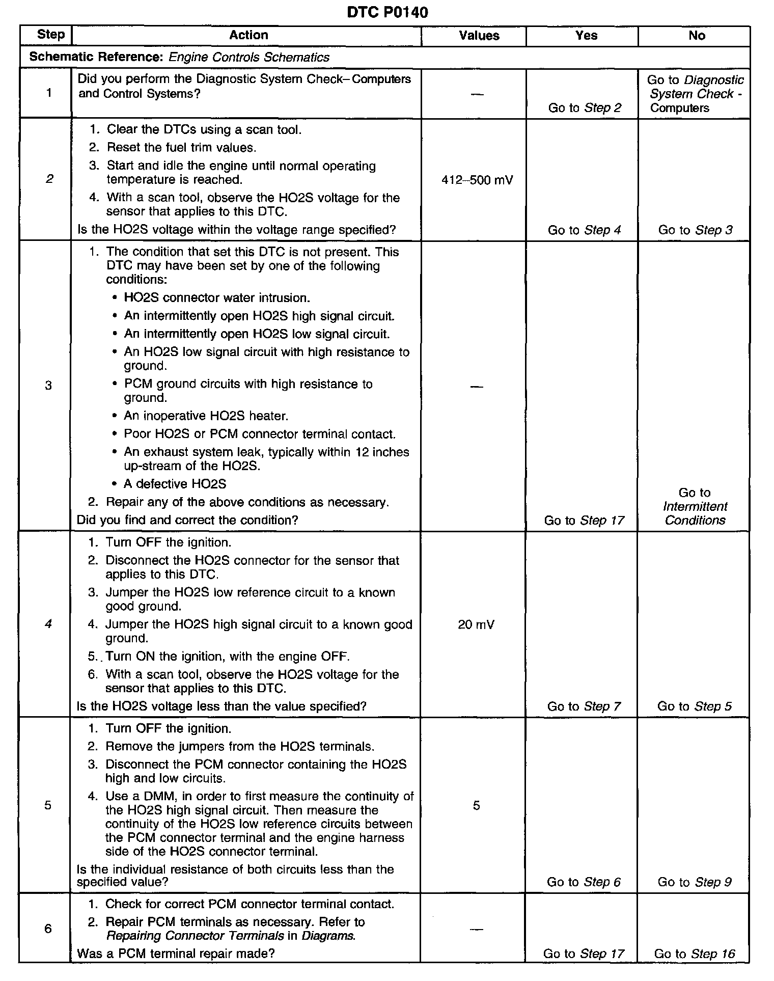 CIRCUIT DESCRIPTIONThe Powertrain Control Module (PCM) supplies a bias voltage of about 450 mV between the Heated Oxygen Sensor (HO2S) signal circuit and the HO2S low reference circuit. When measured with a 10 megohm DMM, this voltage may display as low as 350 mV. The oxygen sensor signal varies from about 800 mV when the exhaust is rich, to about 50 mV when the exhaust is lean. The PCM constantly monitors the HO2S signal during closed loop operation. The PCM then compensates for a rich or lean condition by decreasing or increasing the injector pulse width as necessary. If the HO2S 2 voltage remains at or near the 450 mV bias for an extended period of time, DTC P0140 will set.