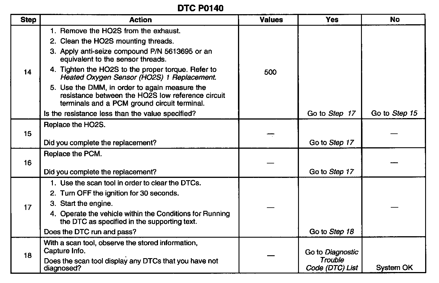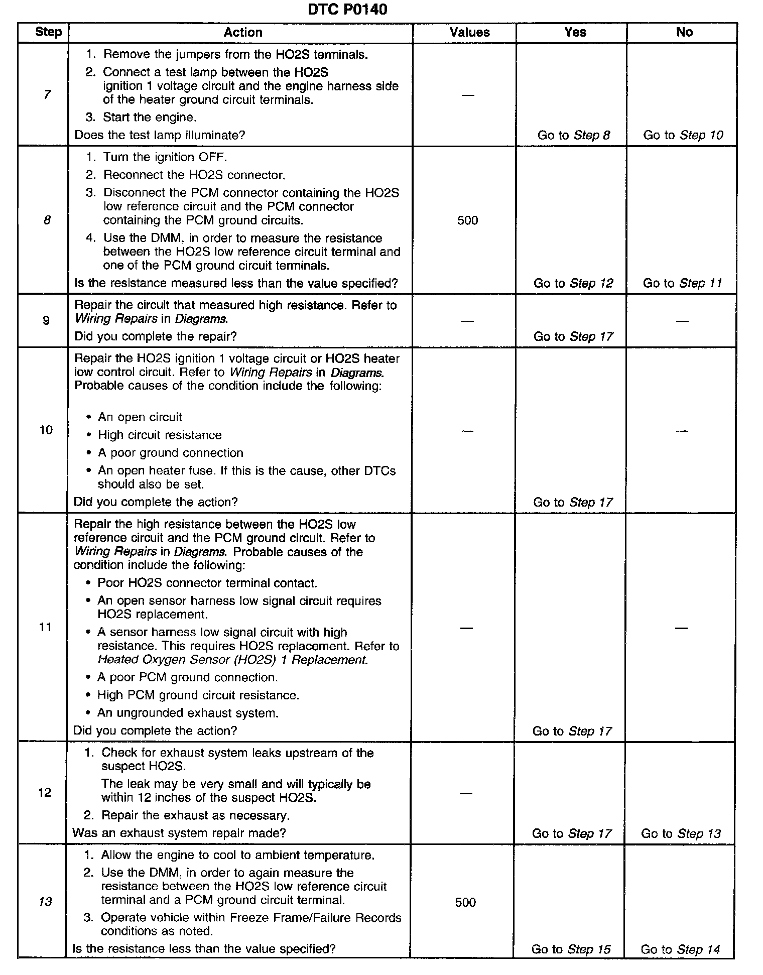 13. This step checks for proper circuit resistance between the HO2S low signal circuits and the PCM ground with a COLD sensor. A loose HO2S or poor thread to exhaust electrical contact will cause higher resistance when the HO2S is cold. Although 500 ohms is allowed, typical resistance should be less than 50 ohms.