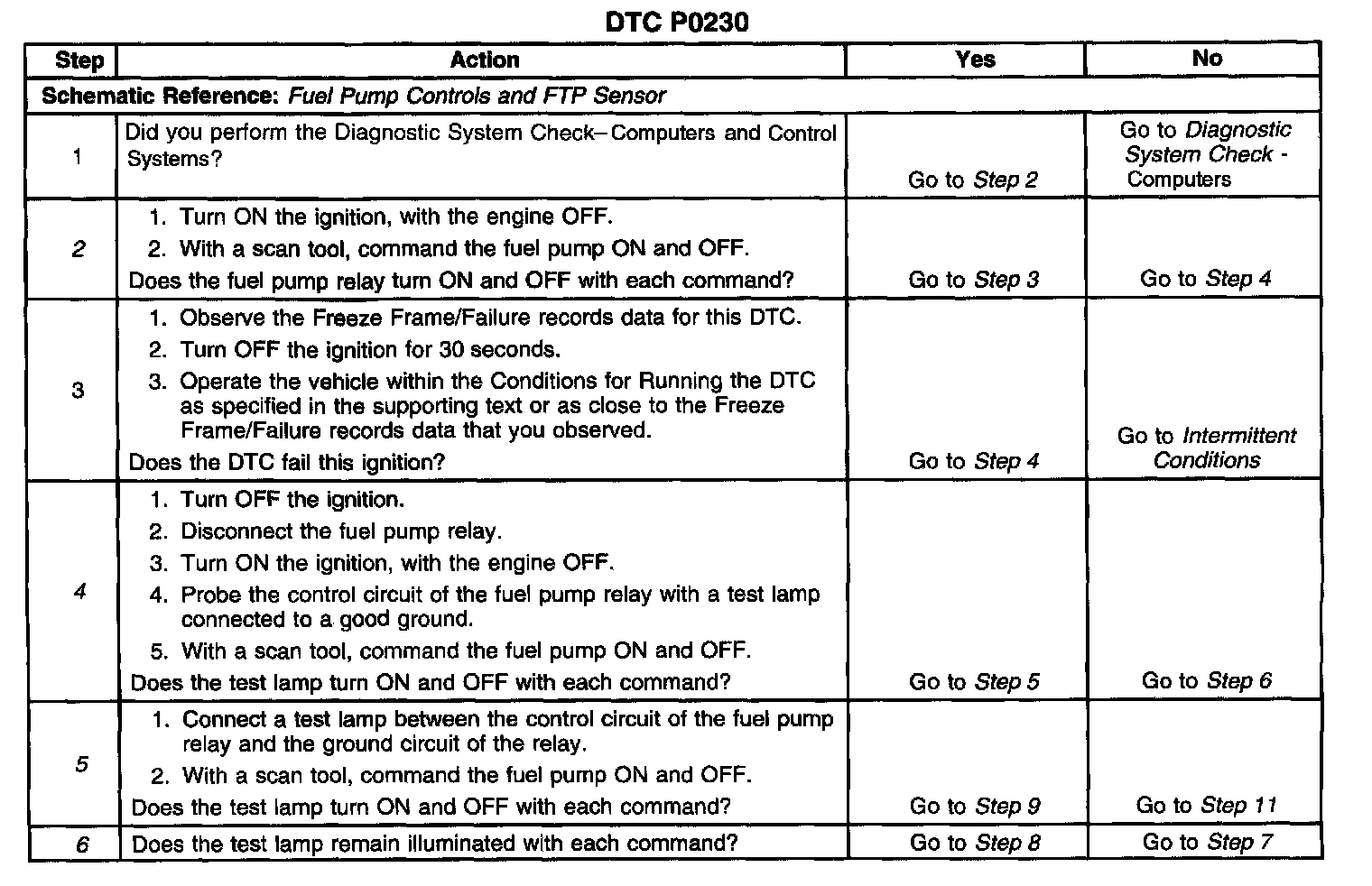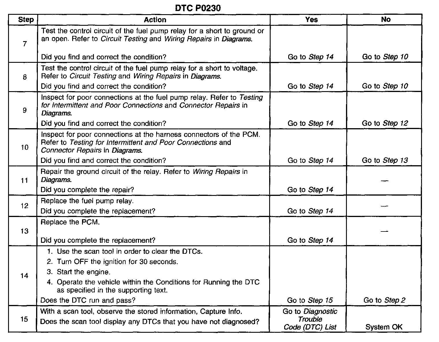 CIRCUIT DESCRIPTIONThe Powertrain Control Module (PCM) provides ignition positive voltage to the coil side of the fuel pump relay. When the ignition switch is first turned ON, the PCM energizes the fuel pump relay, which applies power to the fuel pump. The PCM enables the fuel pump relay as long as the engine is cranking or running, and crankshaft reference pulses are received. If no crankshaft reference pulses are received, the PCM de-energizes the fuel pump relay after 2 seconds. The PCM monitors the voltage on the fuel pump relay control circuit. If the PCM detects an incorrect voltage on the fuel pump relay control circuit, DTC P0230 sets.