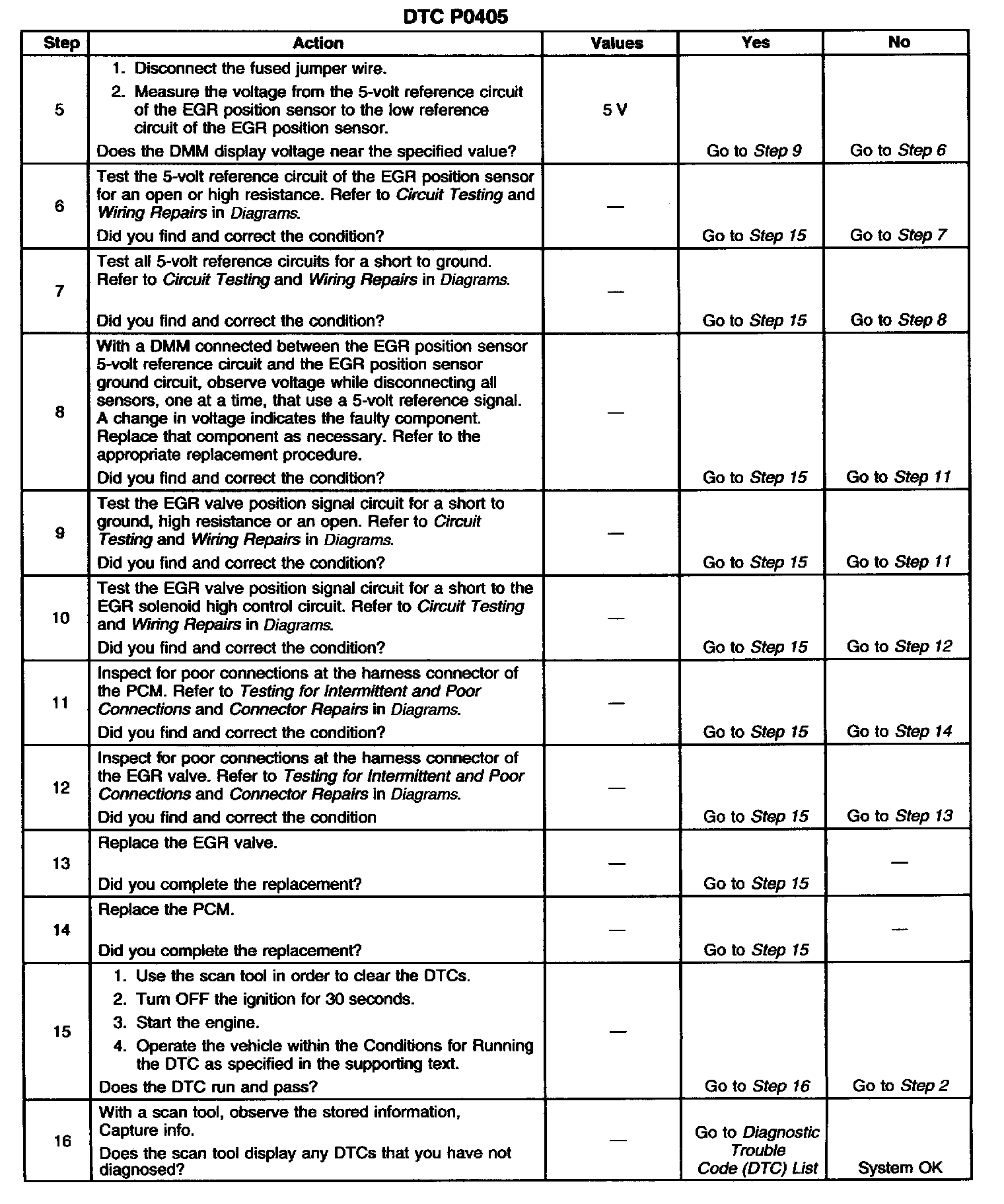 CIRCUIT DESCRIPTIONThe Powertrain Control Module (PCM) monitors the Exhaust Gas Recirculation (EGR) valve pintle position input to ensure that the valve responds properly to commands from the PCM and to detect a fault if the pintle position sensor circuit is open or shorted. If the PCM detects an excessively low EGR position sensor signal voltage, this DTC will set.