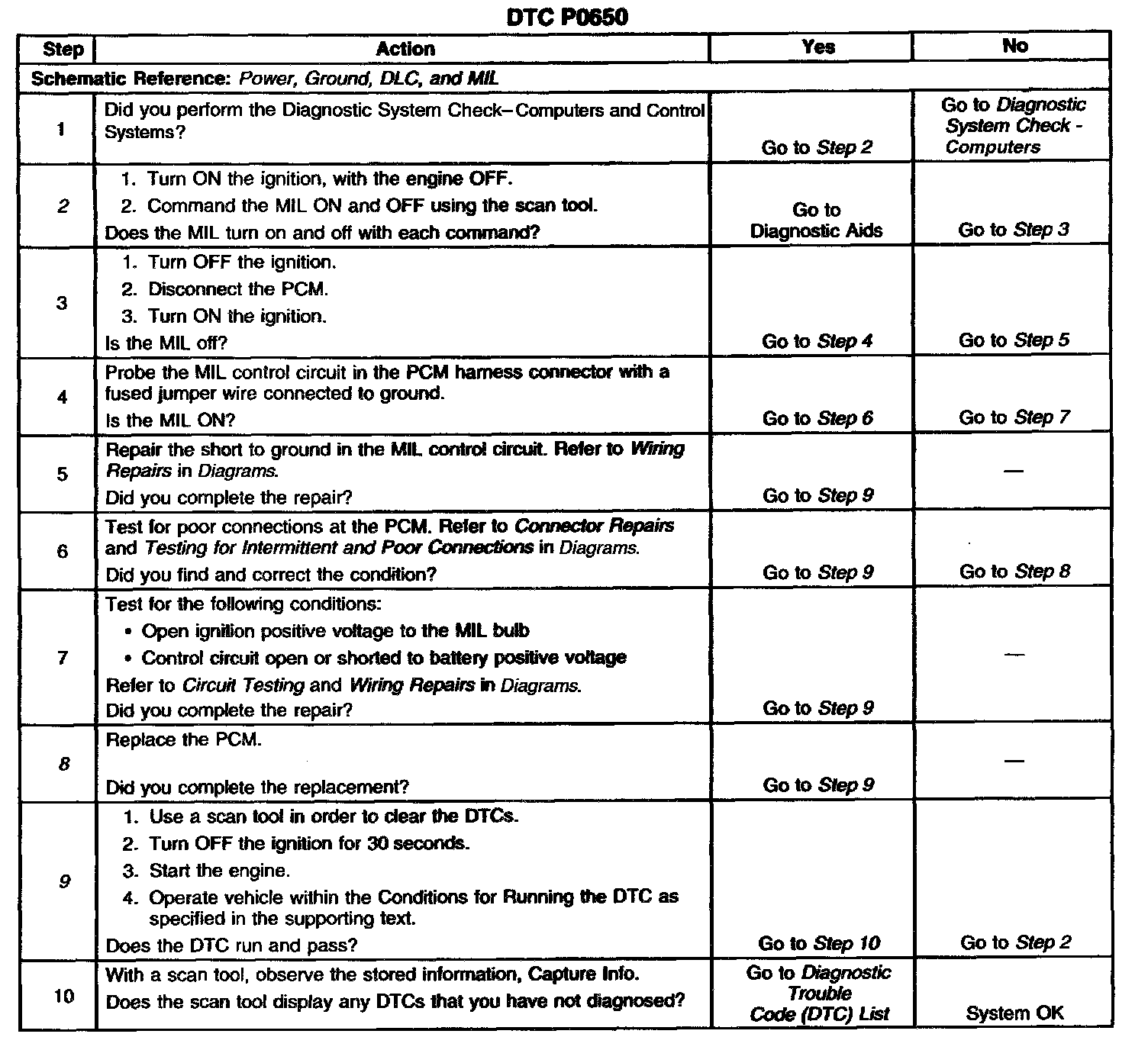 The numbers below refer to the step numbers on the diagnostic table.