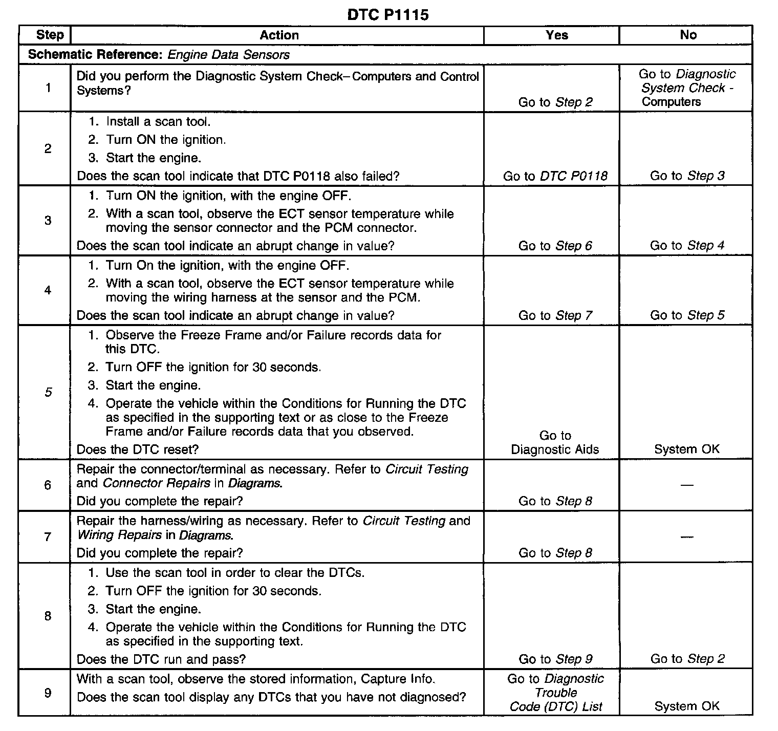 ^ An intermittent open or short to voltage in the ECT sensor signal circuit could result in a DTC P1115. If the high ECT voltage (low temperature) reading is present, additional sensor circuit voltage codes could be set. Refer to any non-intermittent DTCs that are set.
