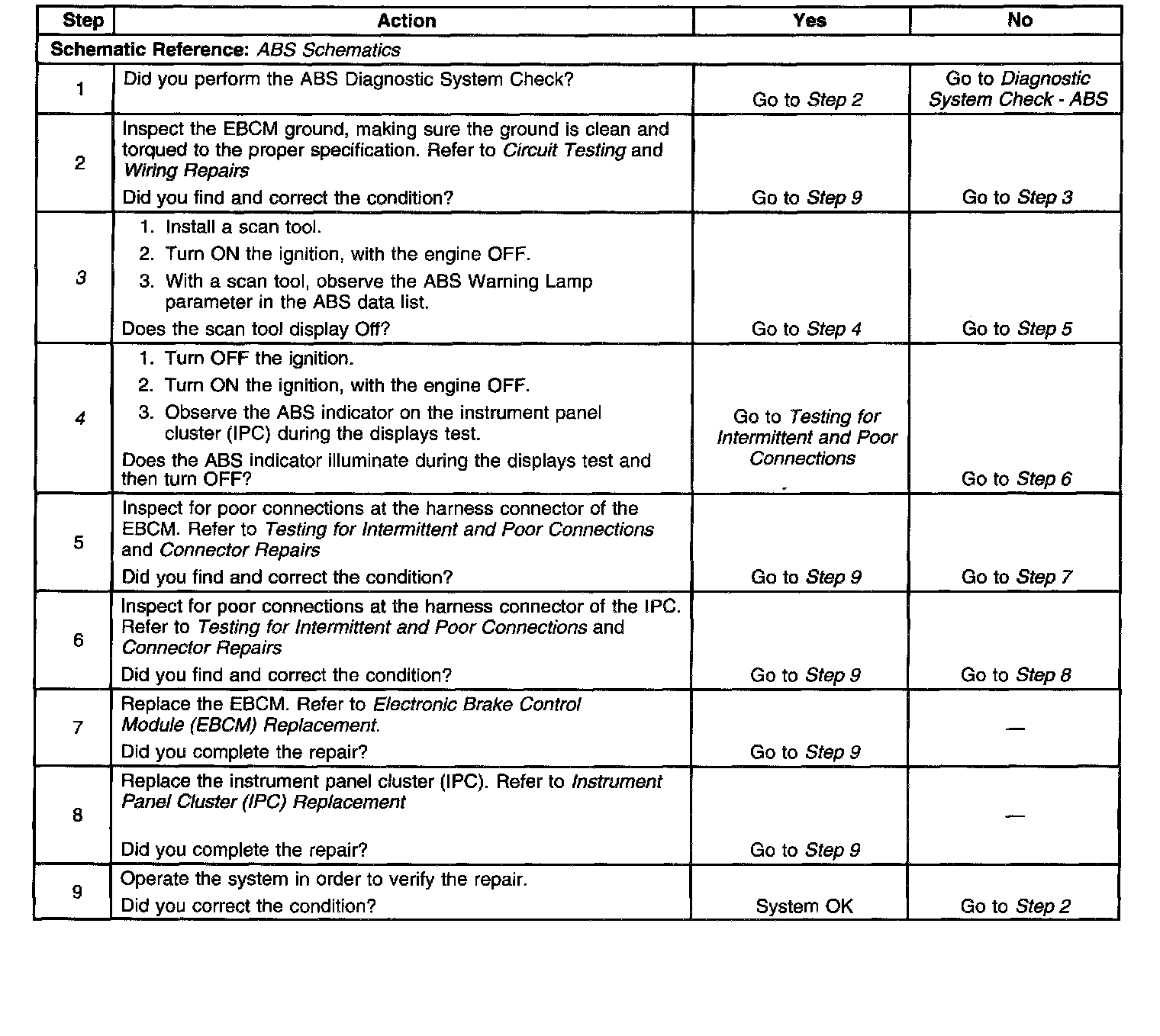 The instrument cluster controls the operation of the ABS indicator. The EBCM reports the desired status of the ABS indicator via serial data messages.