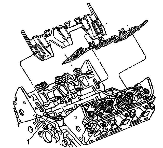 6. With gaskets in place supply a small drop 8-10 mm (0.31-0.39 in) of RTV Sealer GM P/N 12346141 (Canadian P/N 89022195) or equivalent to the 4 corners of the intake manifold to block joint (1).