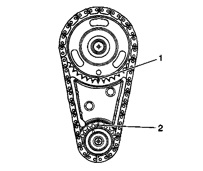 - The timing chain dampener to the camshaft sprocket locator hole (1).