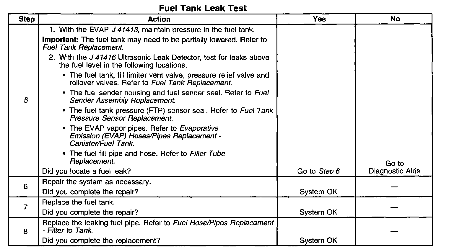 DESCRIPTIONThe fuel tank leak test is used to locate any fuel or fuel vapor escaping the fuel tank area. Fuel vapors escaping above the fuel level will be detected when the Evaporative Emission (EVAP) diagnostics completes one test cycle. The Malfunction Indicator Lamp (MIL) will illuminate after the EVAP diagnostics completes two test cycles.