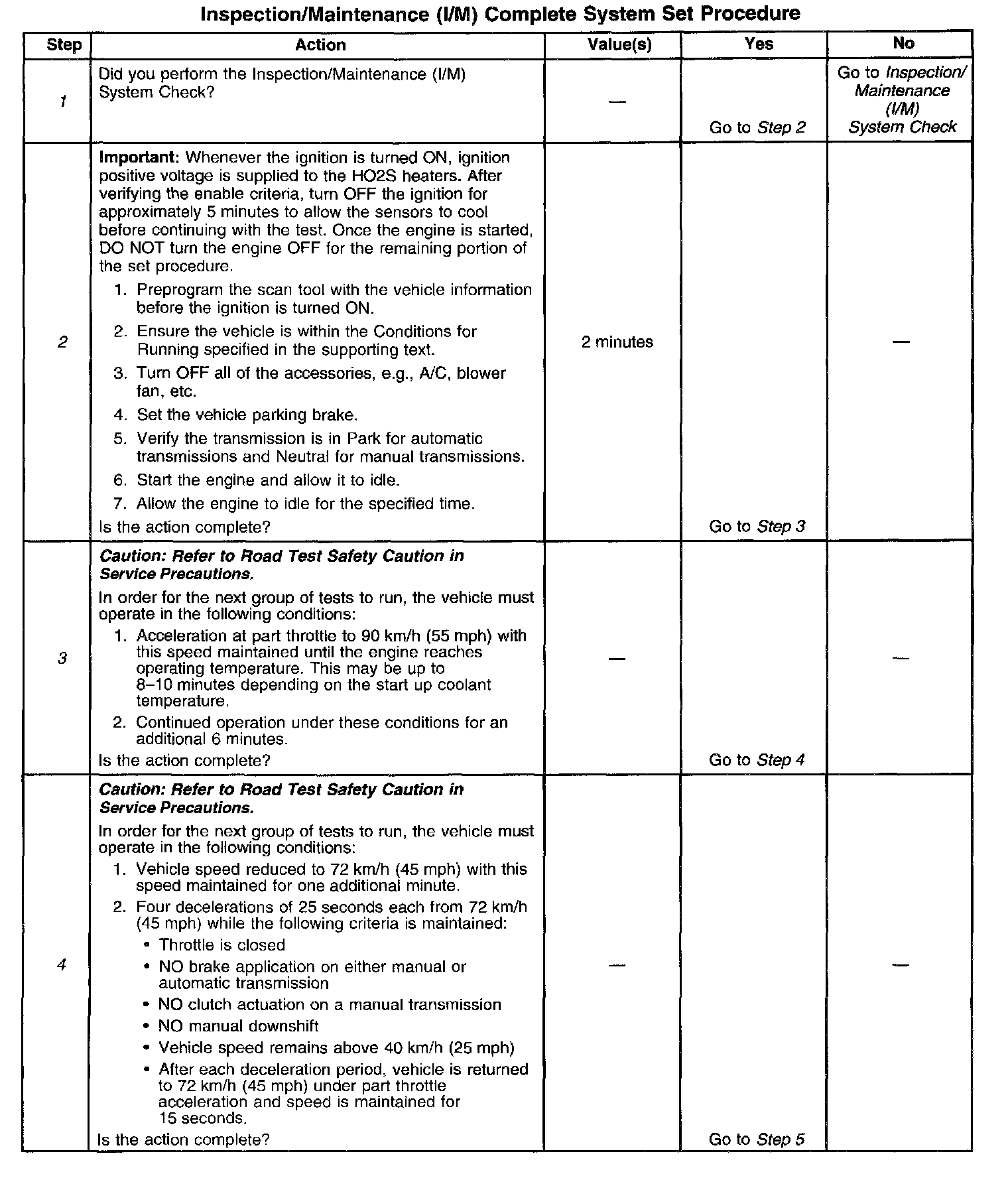 DESCRIPTIONThe purpose of the I/M Complete System Set Procedure is to satisfy the enable criteria necessary to execute all of the I/M readiness diagnostics, and complete the trips for those particular diagnostics. When all diagnostic tests are completed, the I/M System Status indicators are set to YES. Perform this test when more than one or all of the I/M System Status indicators are set to NO.