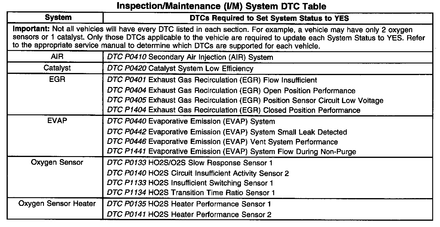 Inspection/Maitenance (I/M) System (DTC) Table