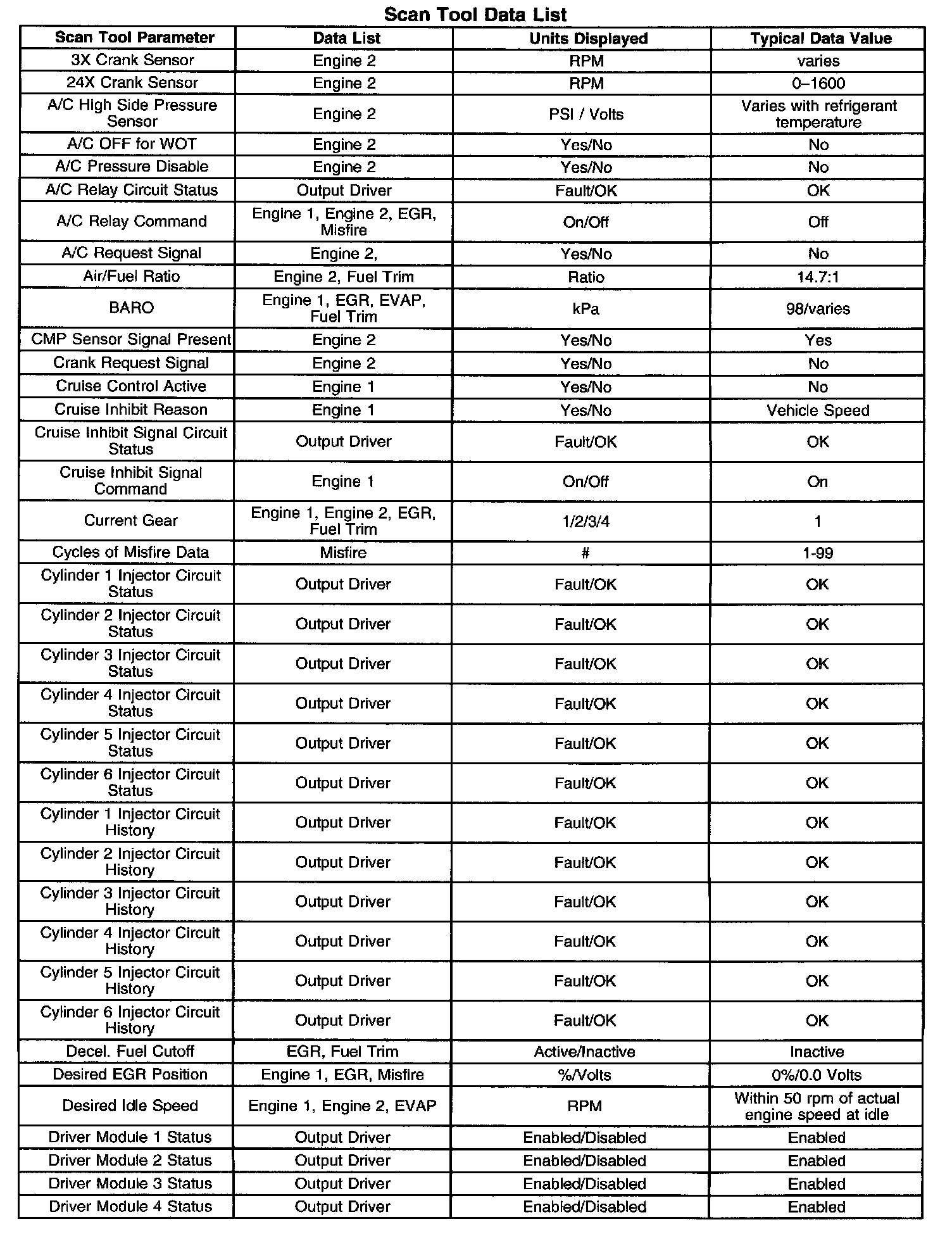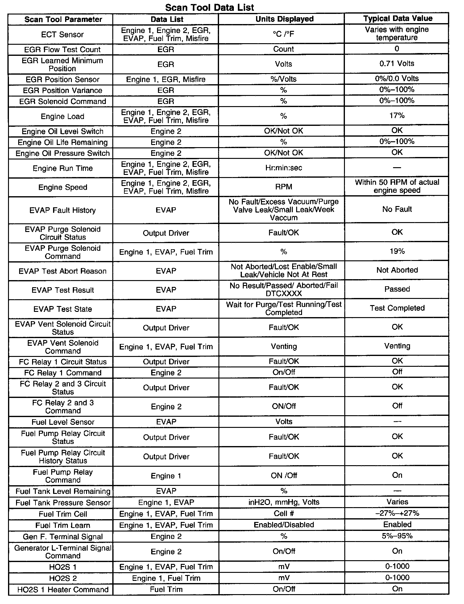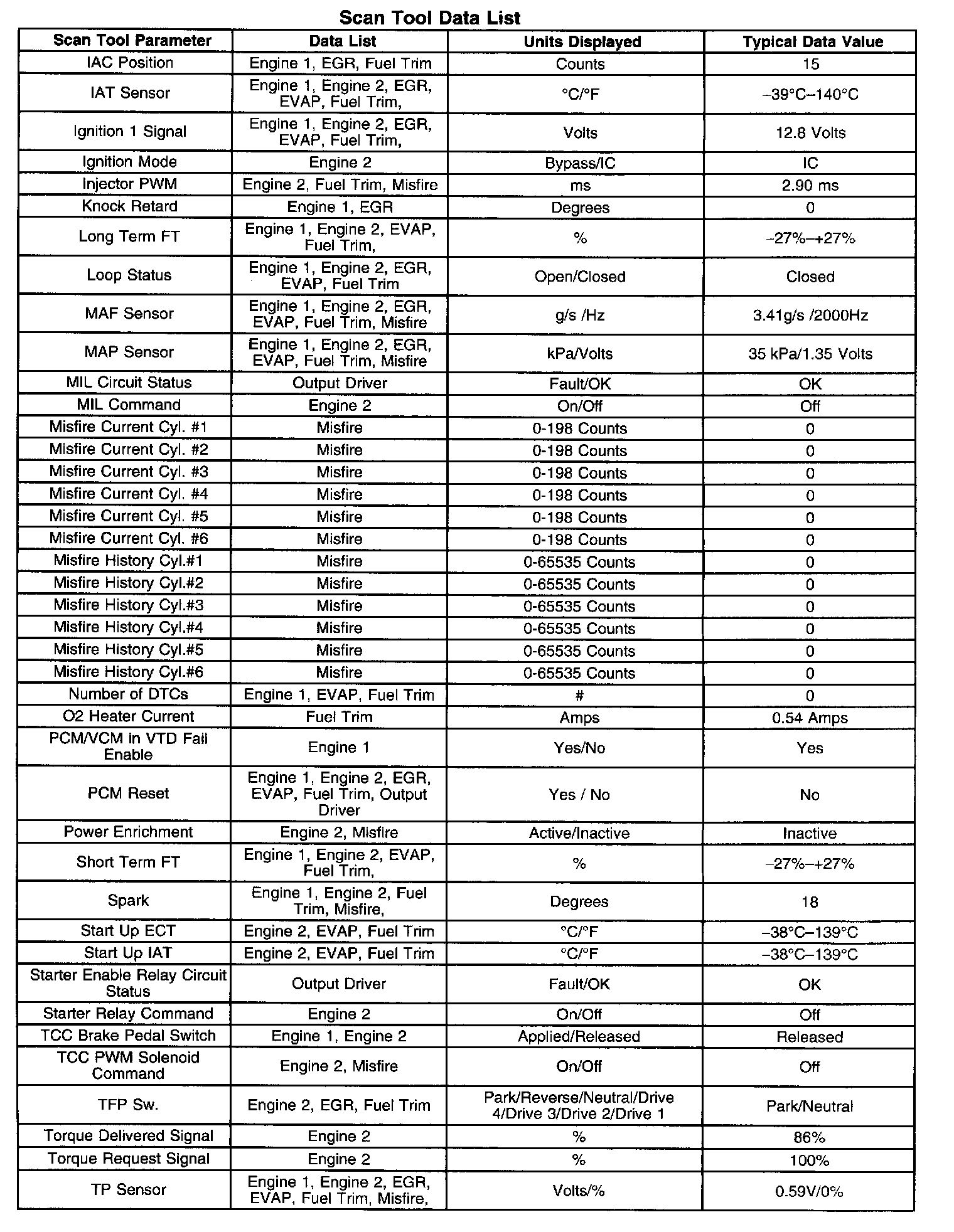 Use the Typical Scan Data Values table only after the Powertrain On Board Diagnostic (OBD) System Check has been completed, no DTCs were noted and you have determined the on-board diagnostics are functioning properly. Scan tool values from a properly running engine may be used for comparison with the engine you are diagnosing. The Typical Scan Data values represent values that would be seen on a normally running engine.