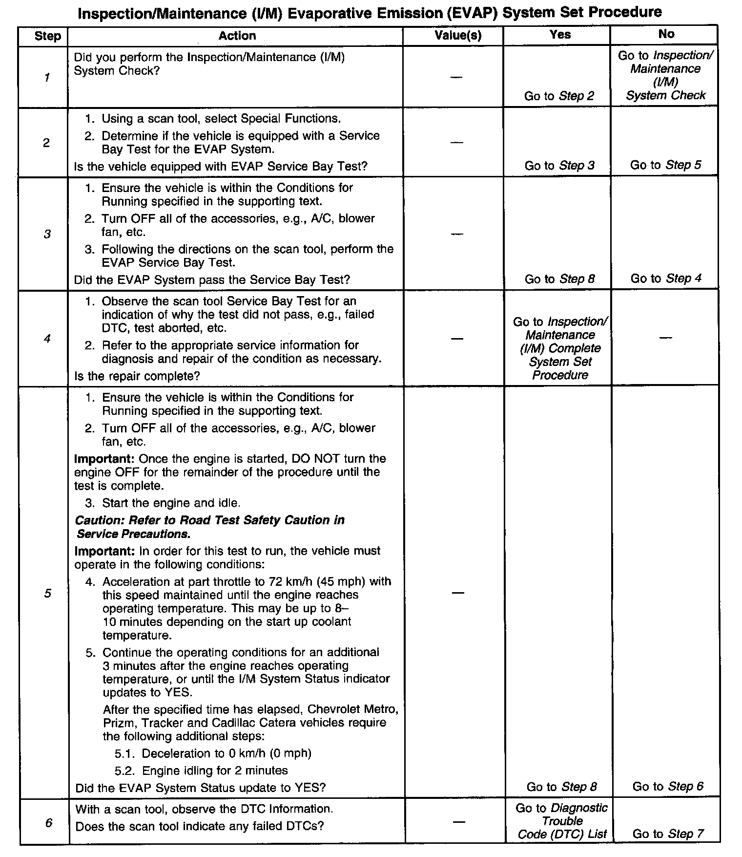 ^ Extreme high or low ambient temperatures may prevent the EVAP System Tests from initiating. Performing a visual inspection prior to running the EVAP Service Bay Test may prevent having to repeat the test. A loose fuel cap may cause a Service Bay Test to abort or fail and prevent the I/M System Status from updating. A failed or aborted test will require the vehicle to cool down in order to meet the enable criteria to run another test.