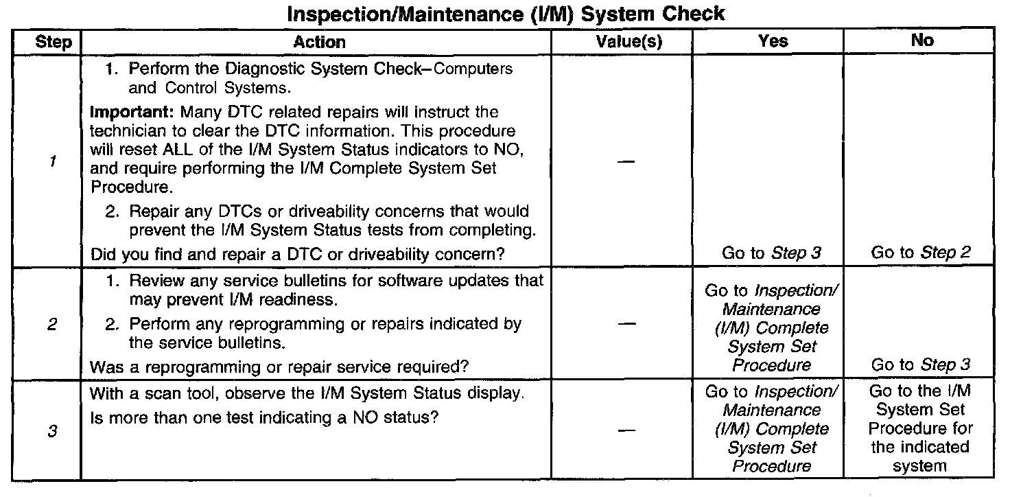 2. Anytime a control module is reprogrammed or the diagnostic trouble codes are cleared as part of a repair procedure, all the I/M System Status indicators will reset to NO.