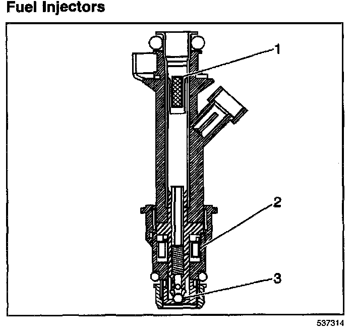 The Multec 2 fuel injector assembly is a solenoid operated device, controlled by the PCM, that meters pressurized fuel to a single engine cylinder. The PCM energizes the high-impedance (12.0 ohms) injector solenoid (2) to open a normally closed ball valve (3). This allows fuel to flow into the top of the injector, past the ball valve, and through a director plate at the injector outlet. The director plate has four machined holes that control the fuel flow, generating a spray of finely atomized fuel at the injector tip. Fuel from the injector tip is directed at the intake valve, causing it to become further atomized and vaporized before entering the combustion chamber. An injector stuck partly open can cause a loss of pressure after engine shutdown. Consequently, long cranking times would be noticed on some engines.