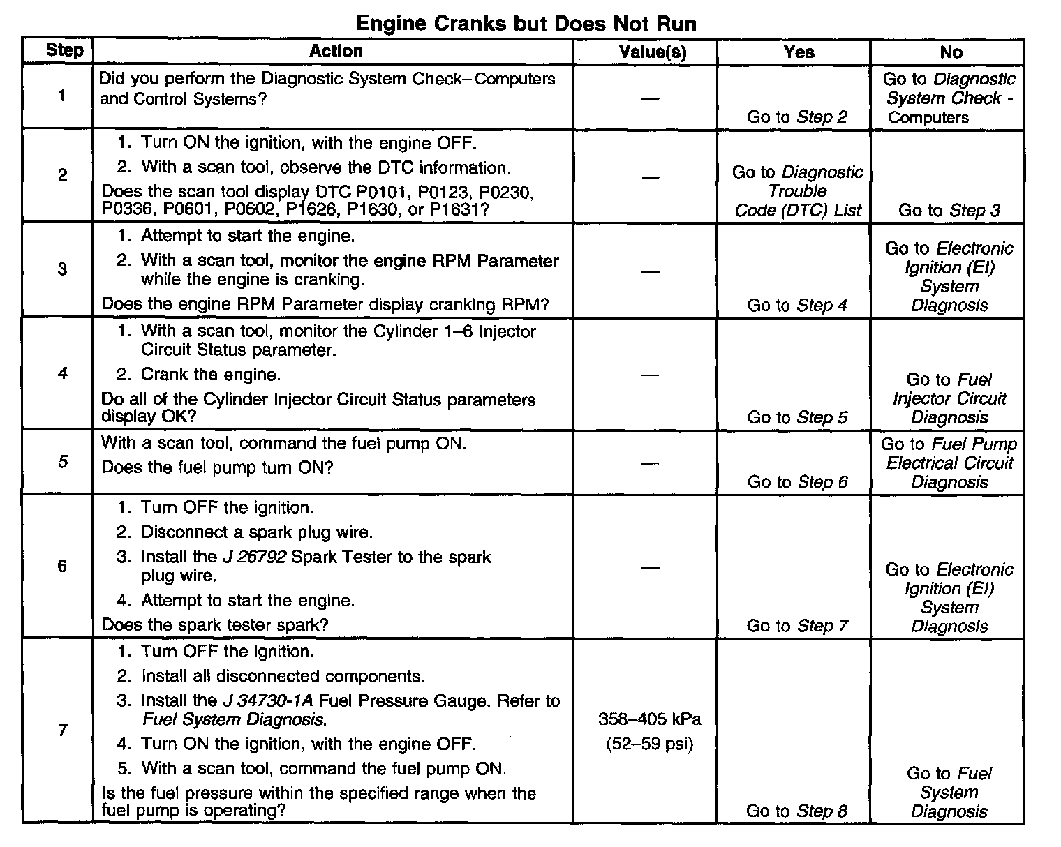 The Engine Cranks but Does Not Run diagnostic table is an organized approach to identifying a condition that causes an engine not to start. The Engine Cranks but Does Not Run diagnostic table directs the service technician to the appropriate system diagnosis. The Engine Cranks but Does Not Run diagnostic table assumes the following: