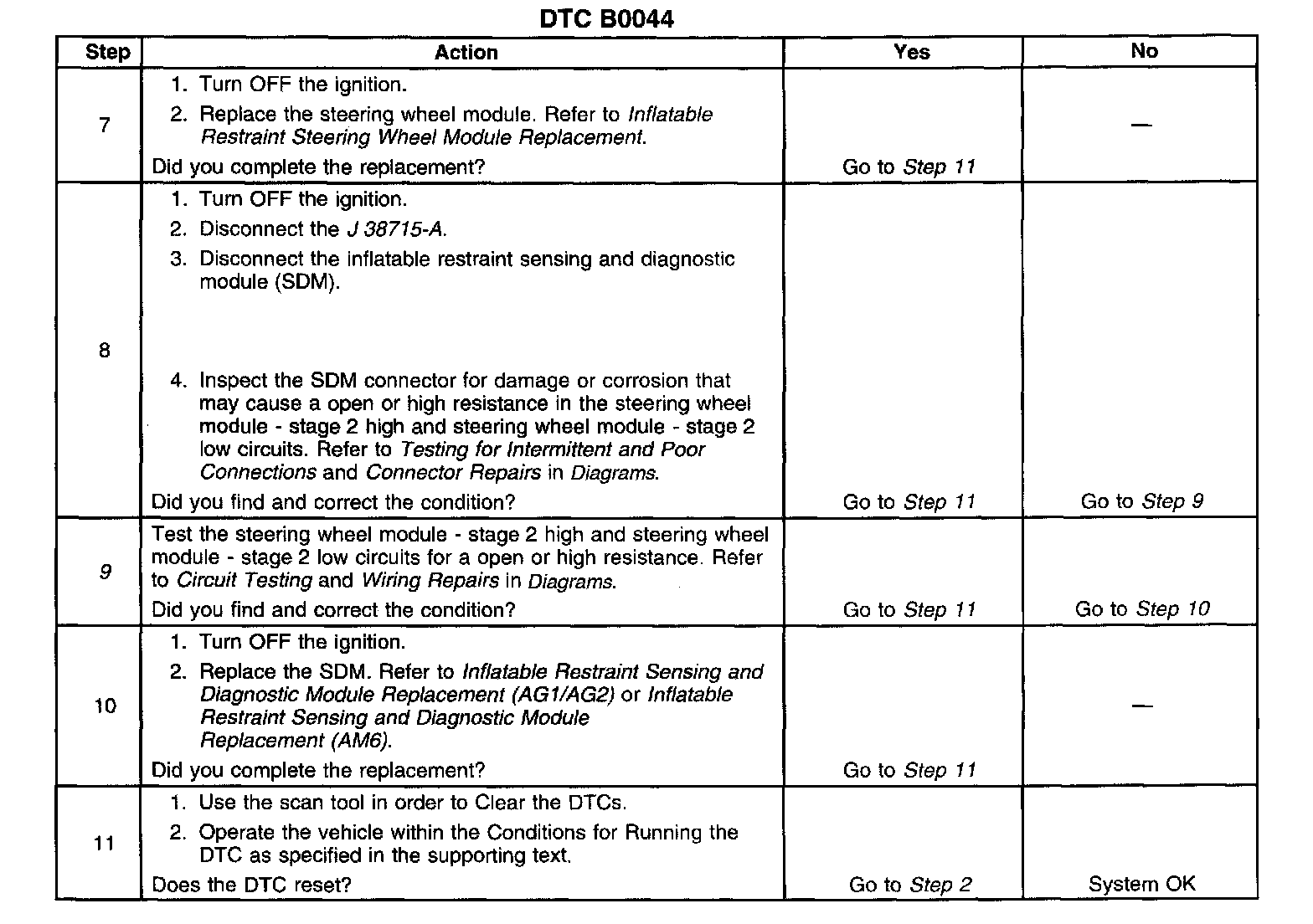 9. Tests for a open or high resistance in the steering wheel module - stage 2 high and steering wheel module - stage 2 low circuits.