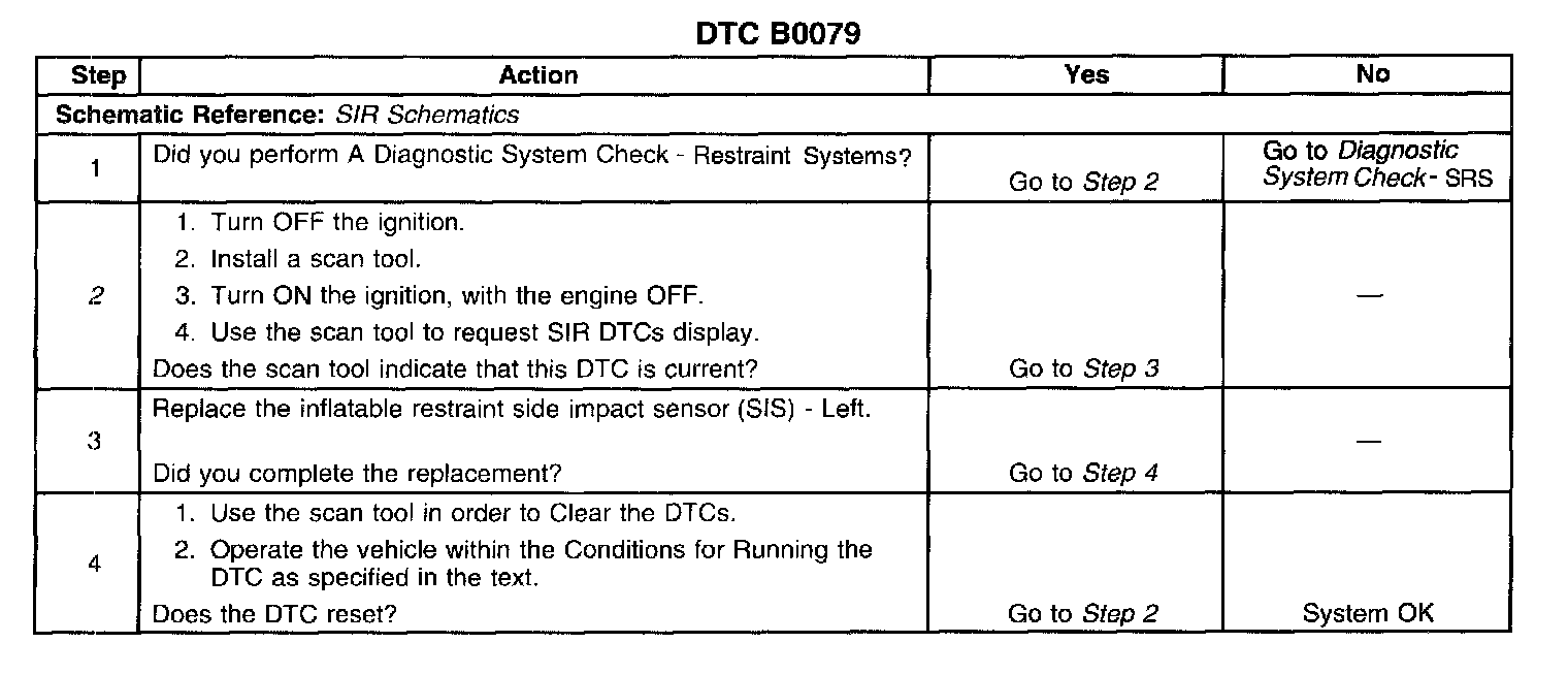 The inflatable restraint side impact sensor (SIS) - Left loop is a 2 wire circuit. When you first turn ON the ignition, the inflatable restraint sensing and diagnostic module (SDM) performs tests to diagnose critical malfunctions within itself. The SDM provides input power to the SIS. When input power is first detected, the SIS responds by performing internal diagnostics. Next the SIS sends an ID message to the SDM. The SDM will consider this to be a valid ID if the response time is less than 5 seconds after the SIS is powered up. The SIS will continually communicate a status message to the SDM. The SDM can reset the 818 by removing and applying power to it.