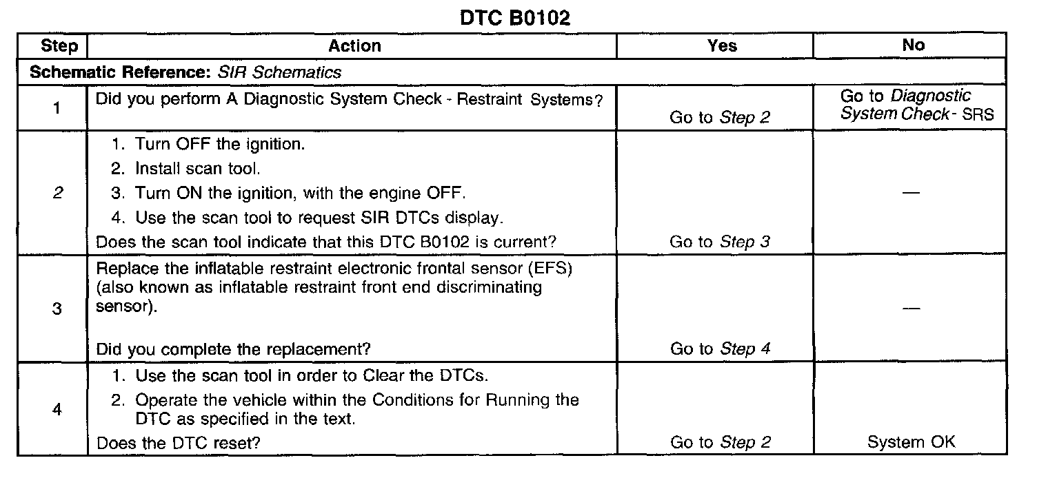 The inflatable restraint electronic frontal sensor (EFS) (also known as inflatable restraint front end discriminating sensor) loop is a 2 wire circuit. When the ignition is turned ON, the inflatable restraint sensing and diagnostic module (SDM) performs tests to diagnose critical malfunctions within itself. The SDM provides input power to the EFS. When input power is first detected, the EFS responds by performing internal diagnostics. Next the EFS sends an ID message to the SDM. The SDM will consider this to be a valid ID if the response time is less than 5 seconds after the EFS is powered up. The EFS will continually communicate a status message to the SDM. The SDM can reset the EFS by removing and applying power to it.