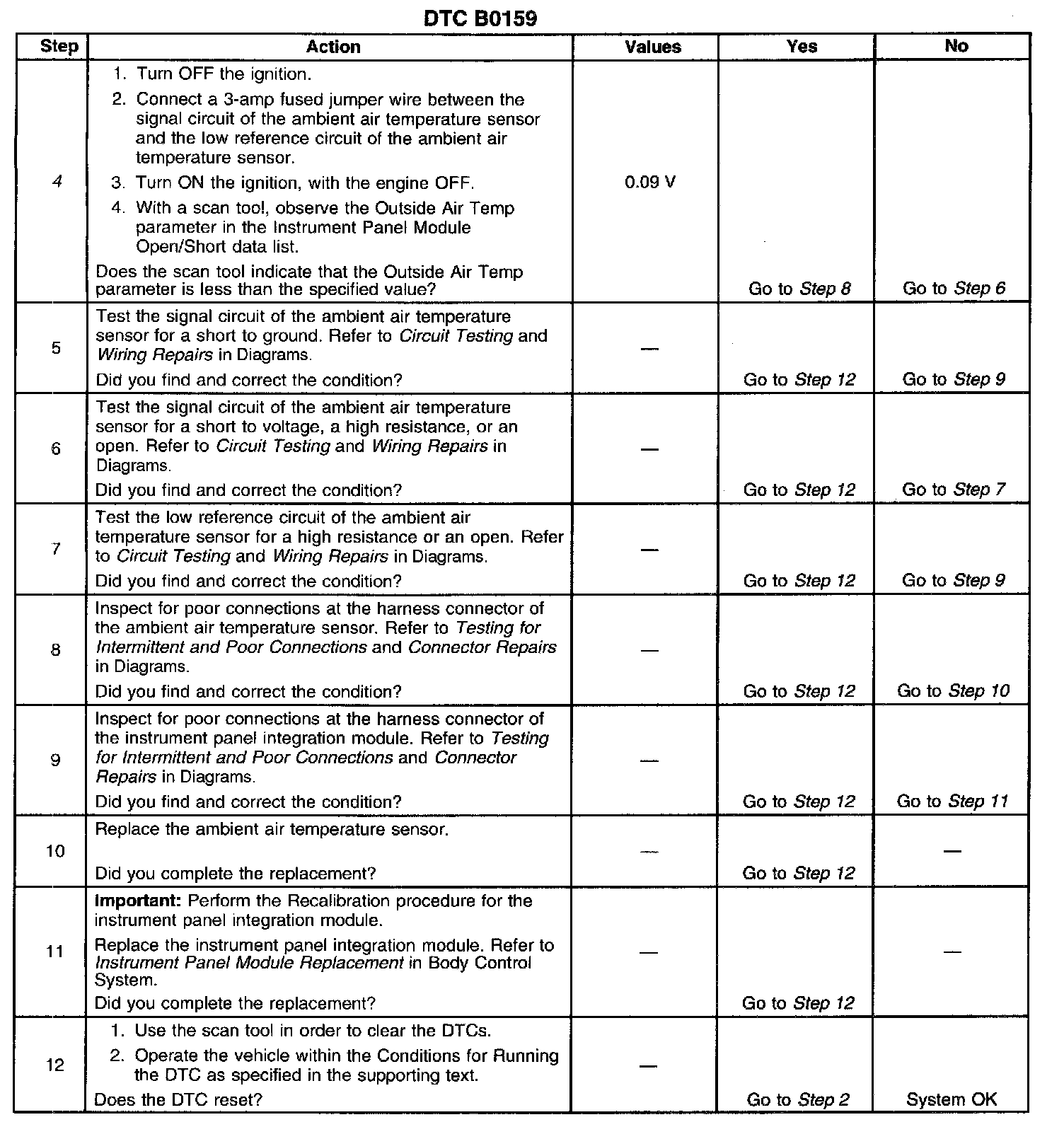 The IPM detects the ambient air temperature sensor signal circuit is less than 0.09 volt (5 counts) or greater than 4.90 volts (250 counts).