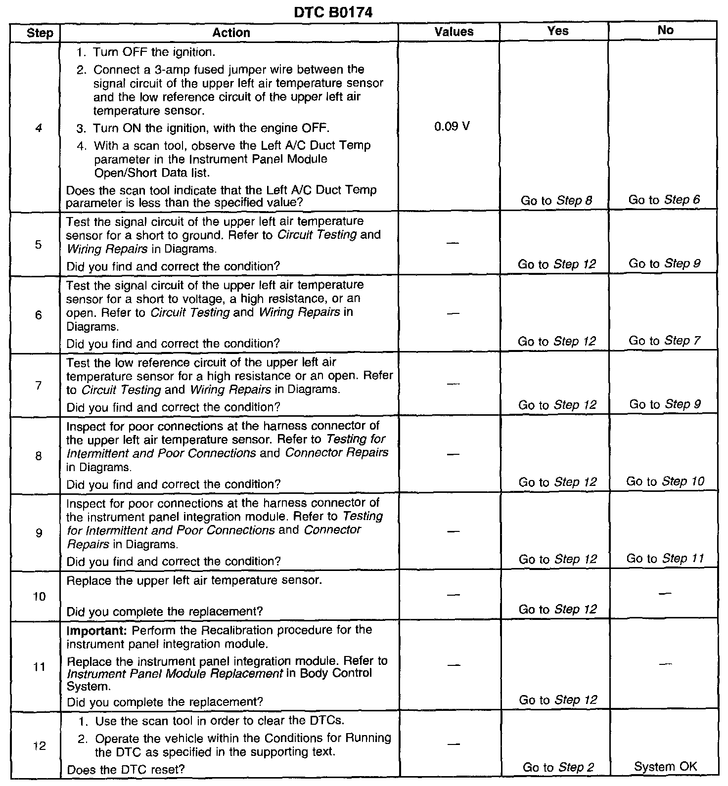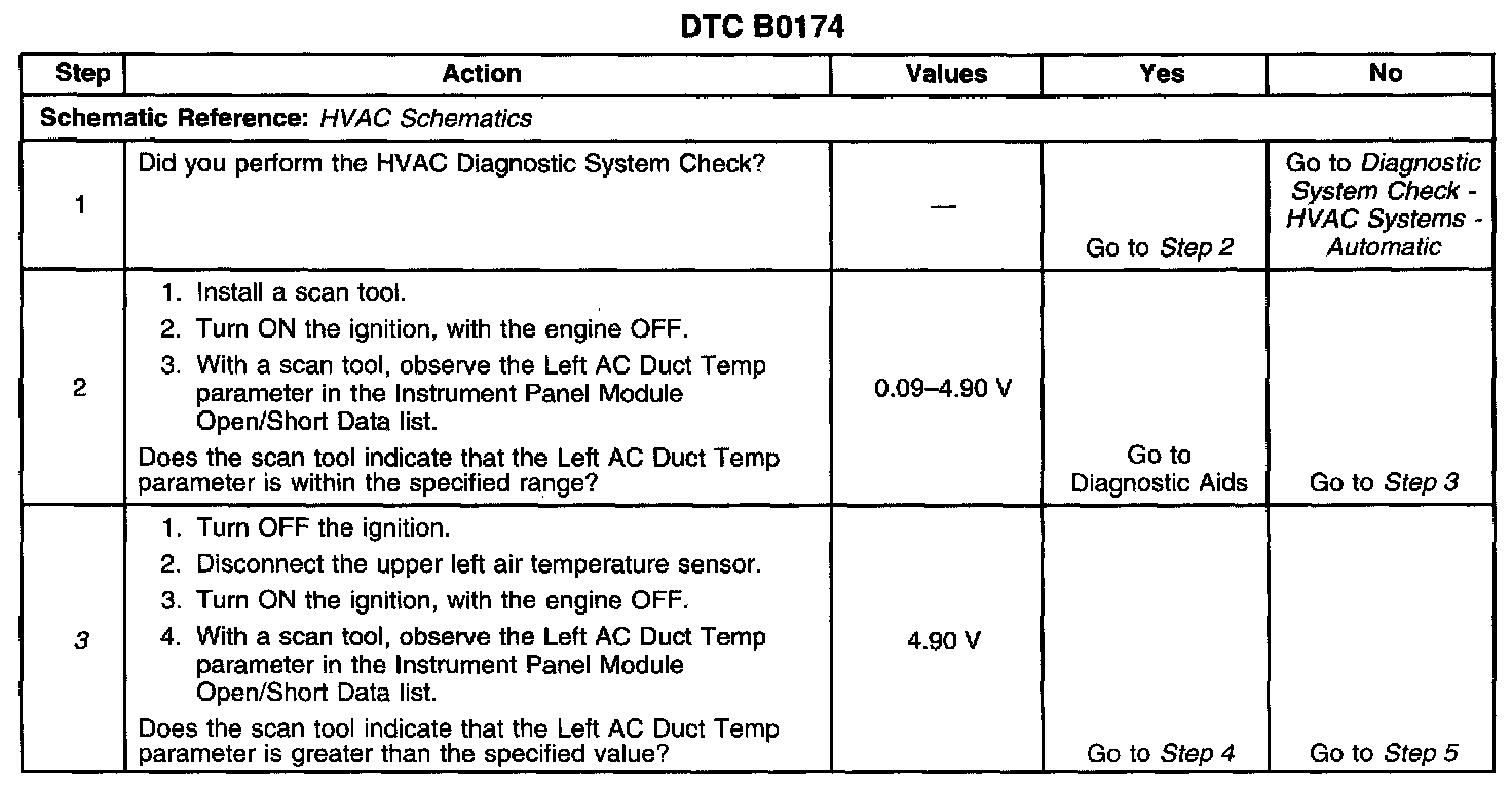 ^ When the ambient air temperature is at or above 16°C (60°F), a default value of 0.19 volt (10 counts) will be substituted for the upper left air temperature sensor data by the IPM. The Left AC Duct Temp. displayed on the scan tool is the default value. The Left AC Duct Temp displayed on the scan tool in the Open/Short data list is the actual value.