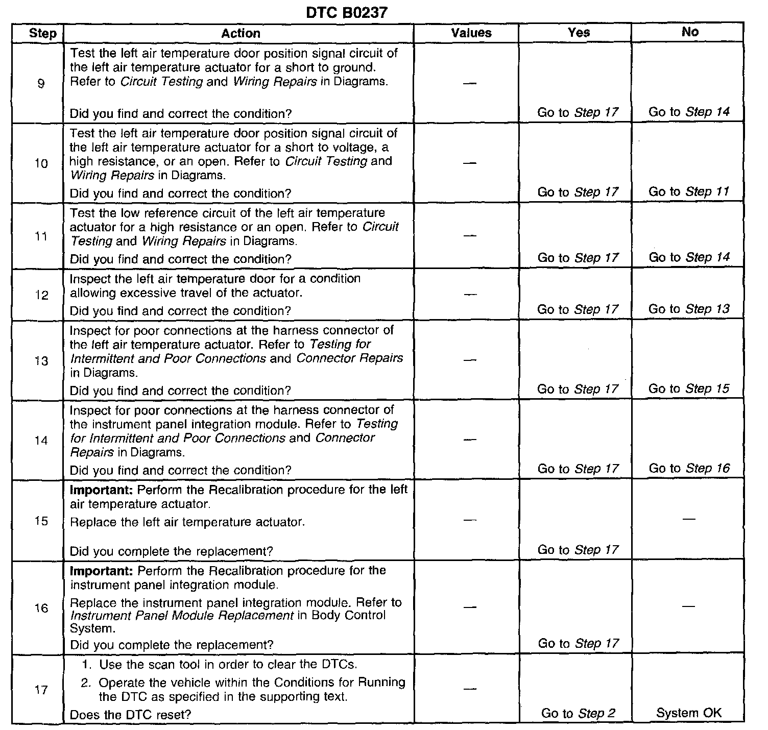 ^ A damaged or broken air temperature door and or actuator can cause this DTC to set by allowing the actuator shaft to rotate unrestricted to its internal stop (overtravel condition). The internal stops are outside of the feedback potentiometers 0-250 count working range.