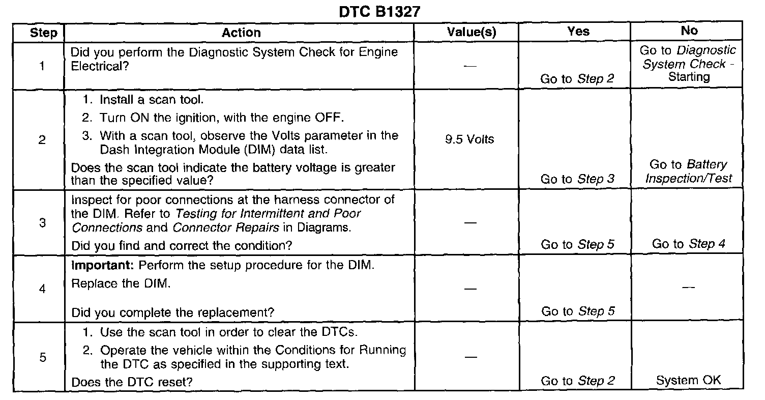 This DTC shall run only if the DIM has power, ground and the ignition is not in START mode. This DTC shall execute regardless of the battery voltage, except when the DTC B1390 is set current.