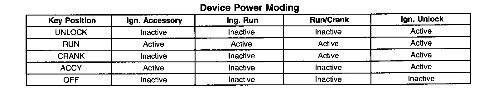 CIRCUIT DESCRIPTIONNormal vehicle Class 2 communications will not commence until the system power mode has been identified. Four discrete wires from the ignition switch contacts are monitored by the Dash Integration Module (DIM) in order to determine the present power mode (ignition switch position). The DIM communicates the system power mode to all Class 2 modules on the Class 2 bus.