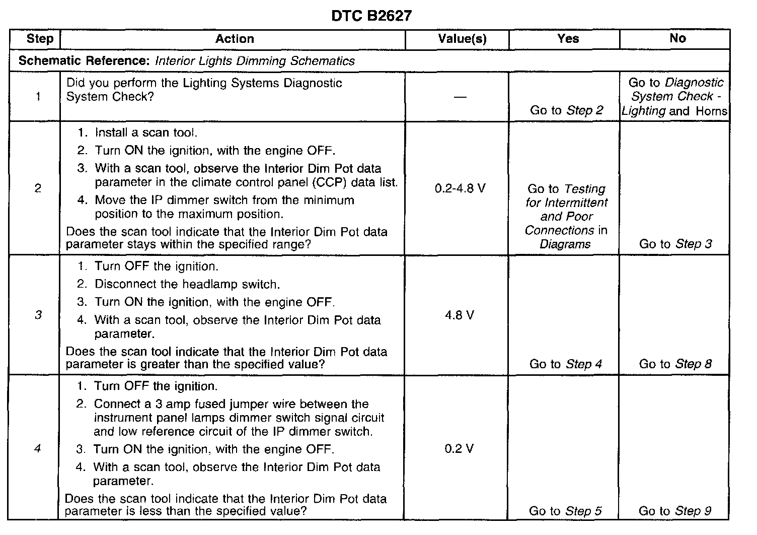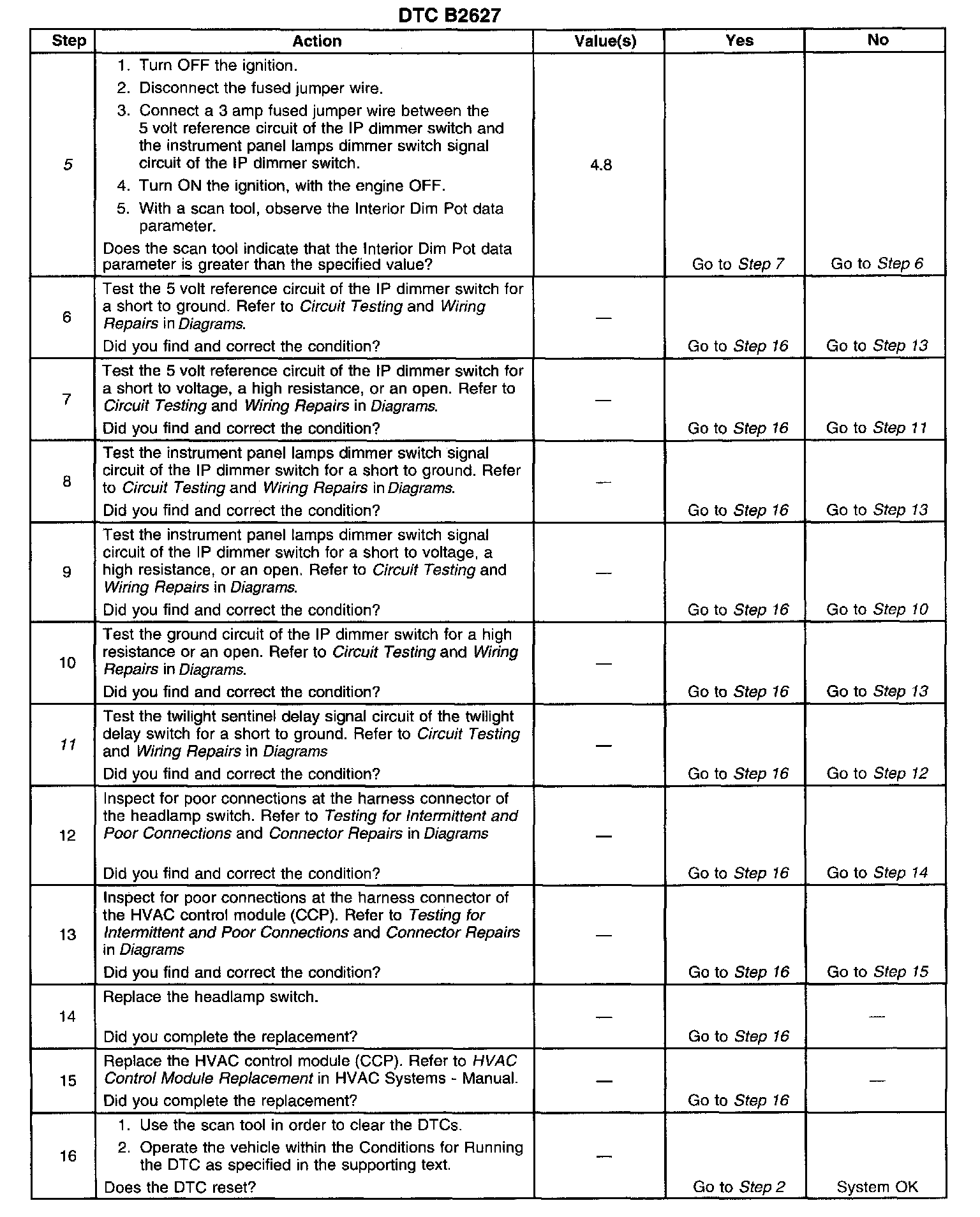 11. Tests for a short to ground in the twilight sentinel delay signal circuit of the twilight delay switch. A short to ground may set DTC B2627 and DTC B2642 depending position of the IP dimmer switch.