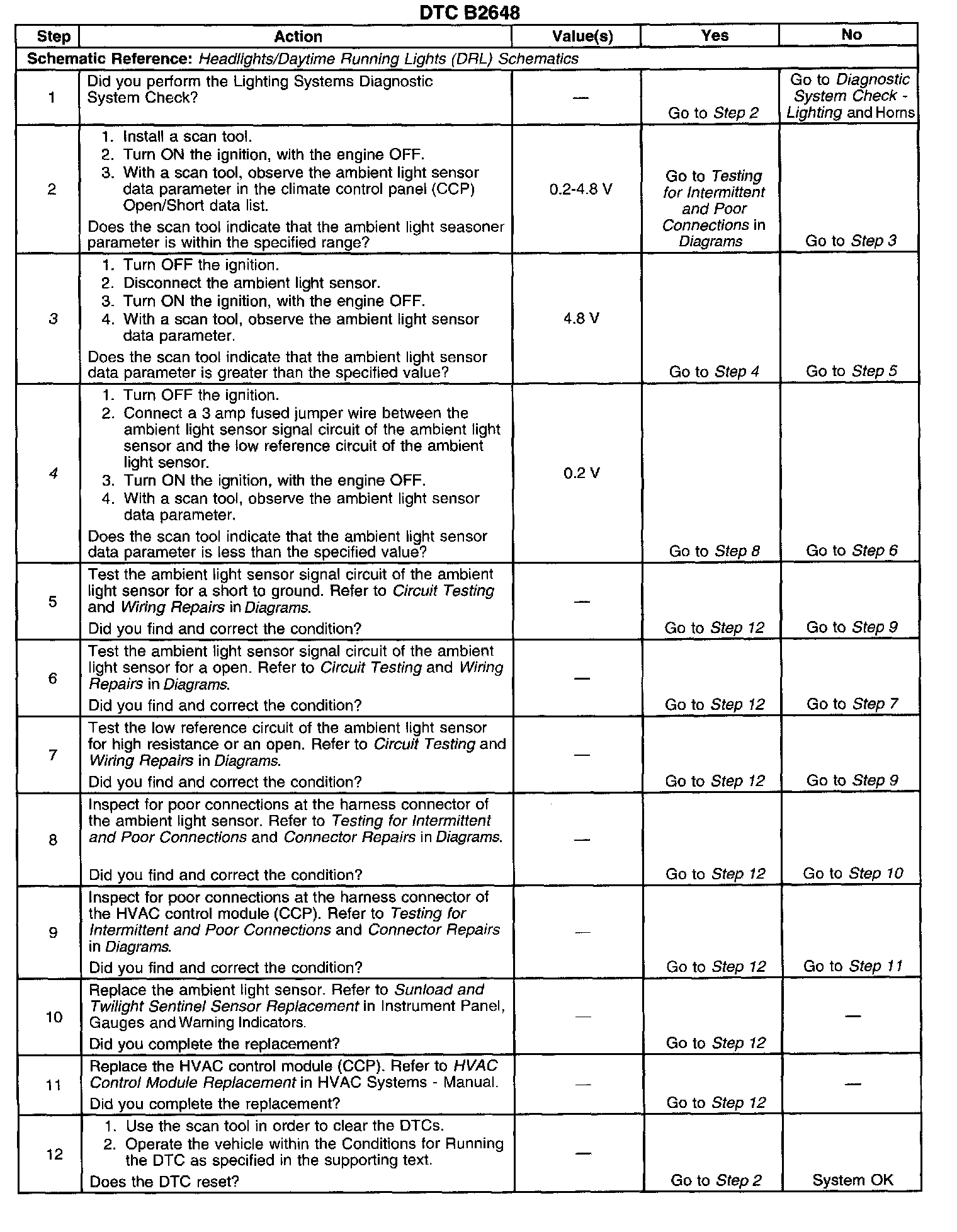 CIRCUIT DESCRIPTIONThe ambient light sensor is a light sensitive photocell. The HVAC control module determines the ambient light based on the voltage from the ambient light sensor. The HVAC control module controls the head lamp automatic on/off and delayed off functions.