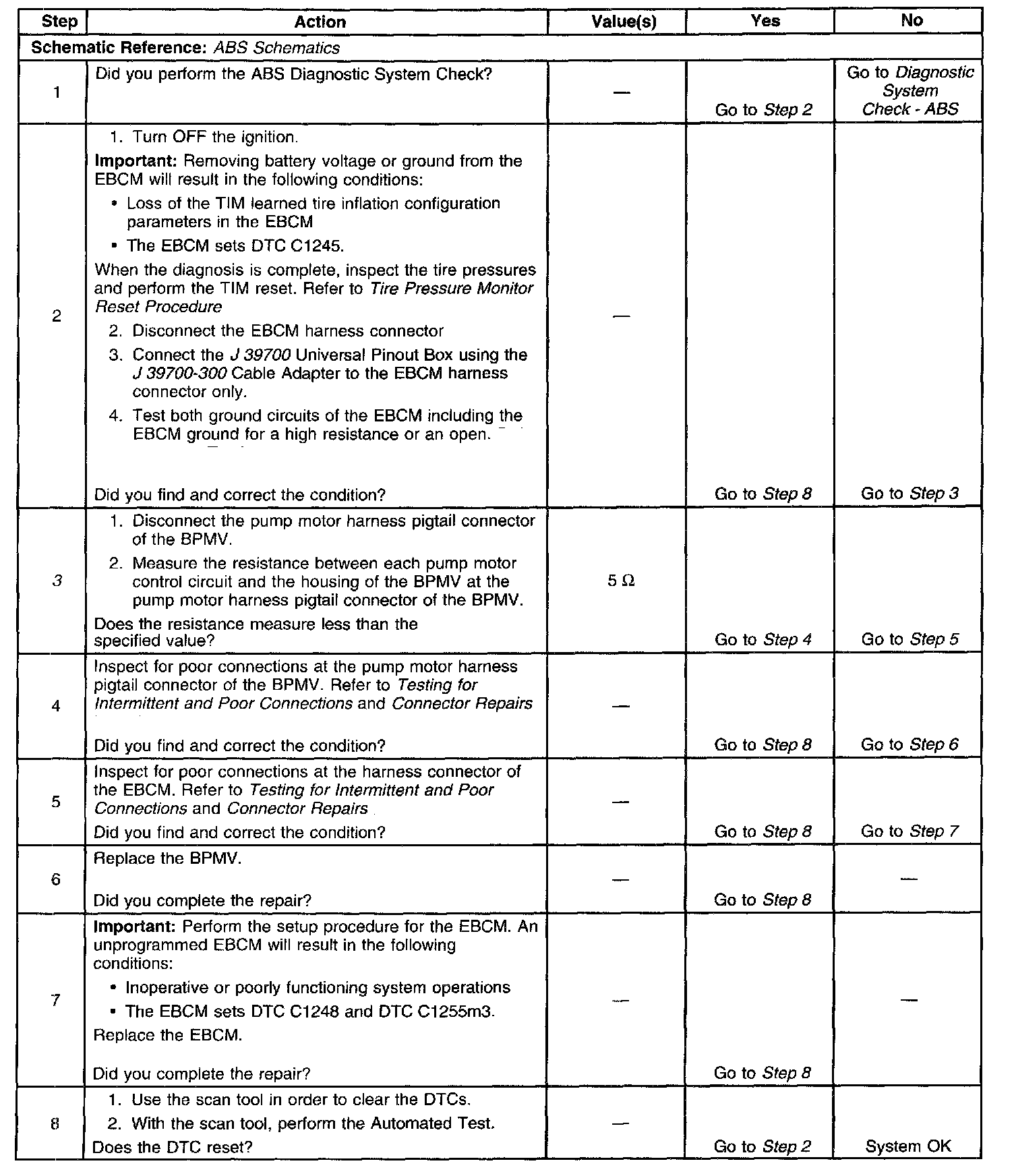 3. Tests the pump motor circuits of the BPMV for a short to the housing of the BPMV. The wiring from the BPMV to the EBCM should not be repaired.