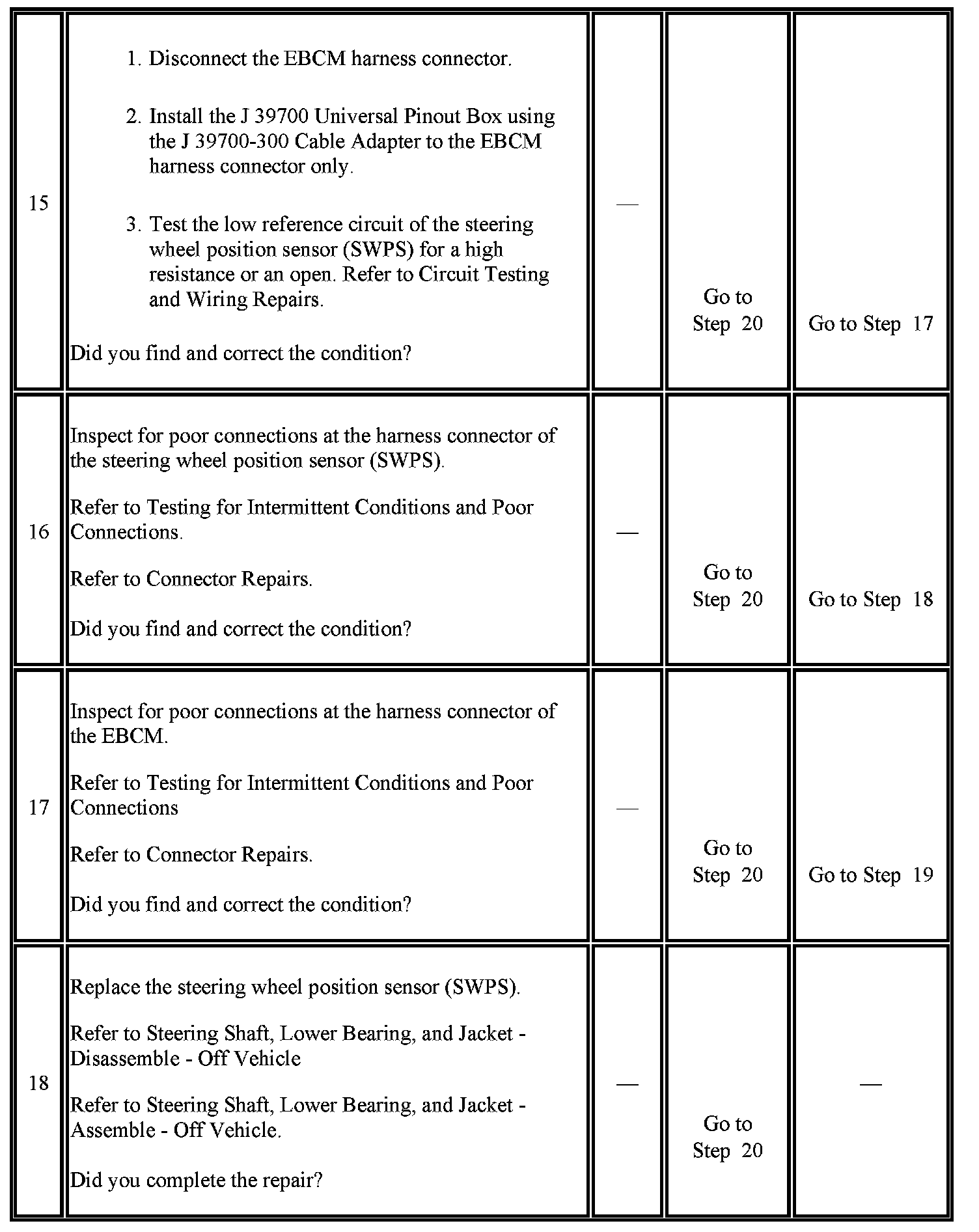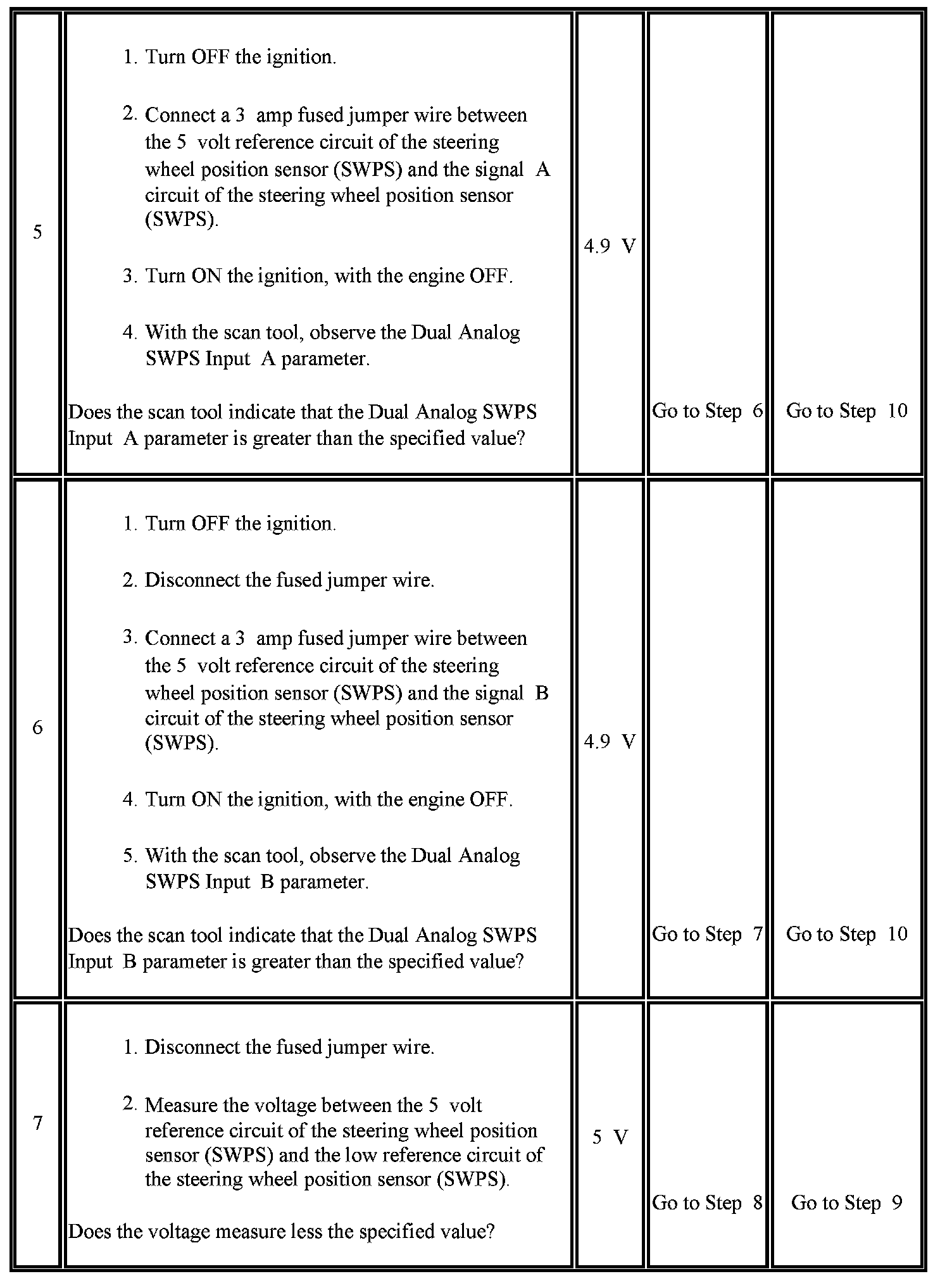 4. Tests for the proper operation of the steering wheel position signal B circuit in the low voltage range.