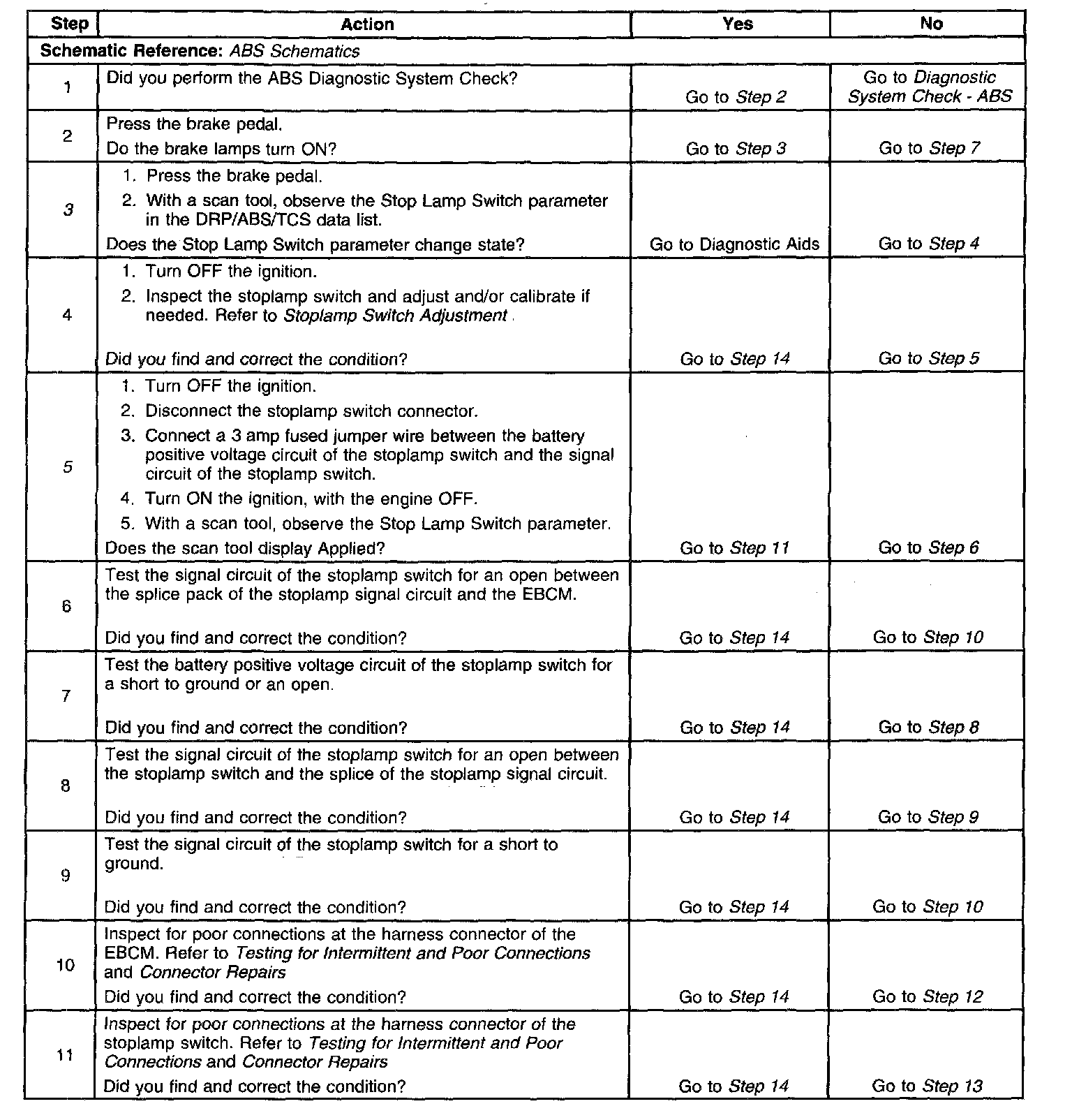 ^ Verify proper stoplamp switch operation using the data list of the scan tool. As the brake is applied, the data list displays the stoplamp switch on within 2.54 cm (1 inch) of travel.