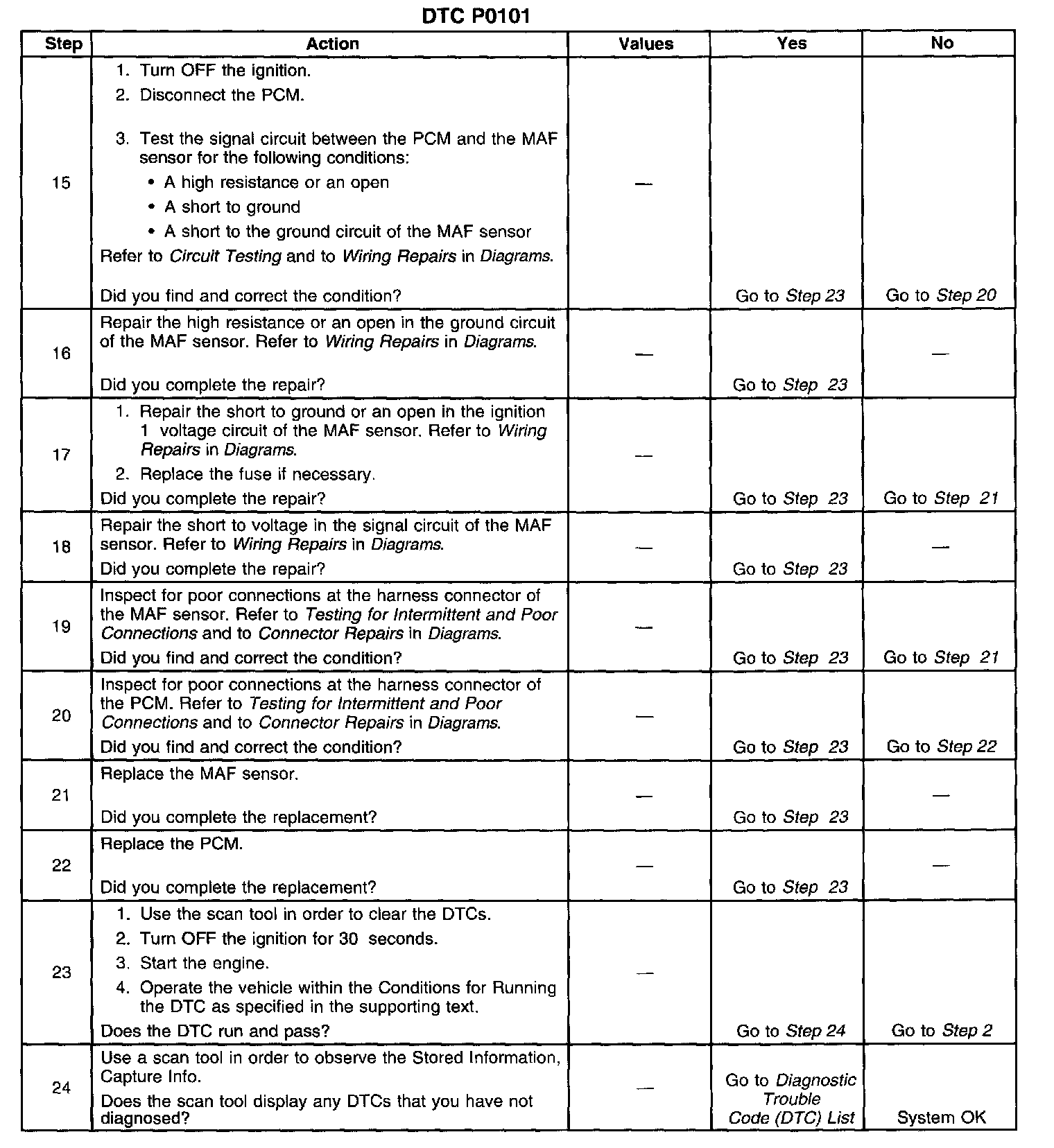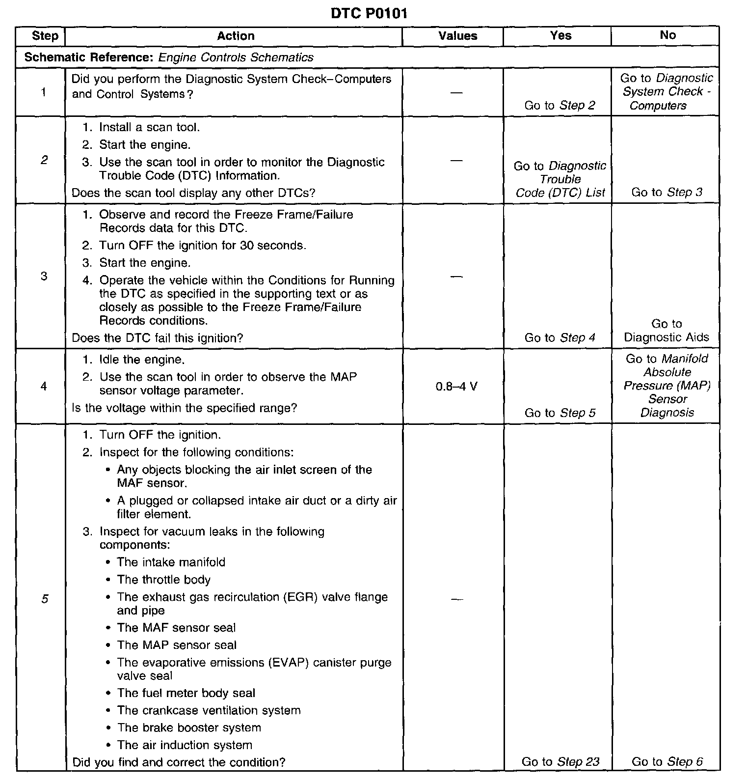 5. Any unmetered air entering the engine may cause this DTC to set. This step eliminates any conditions which can cause a DTC to set with a normally operating MAF sensor.