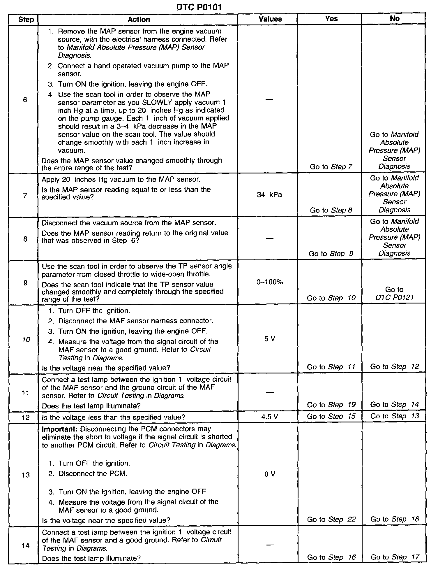 2. Diagnose any MAF, MAP, Throttle Position (TP), or system voltage DTCs before using this table. If a misfire condition exists, or a rough running condition is observed with or without DTC P0300, proceed to DTC P0300 first.
