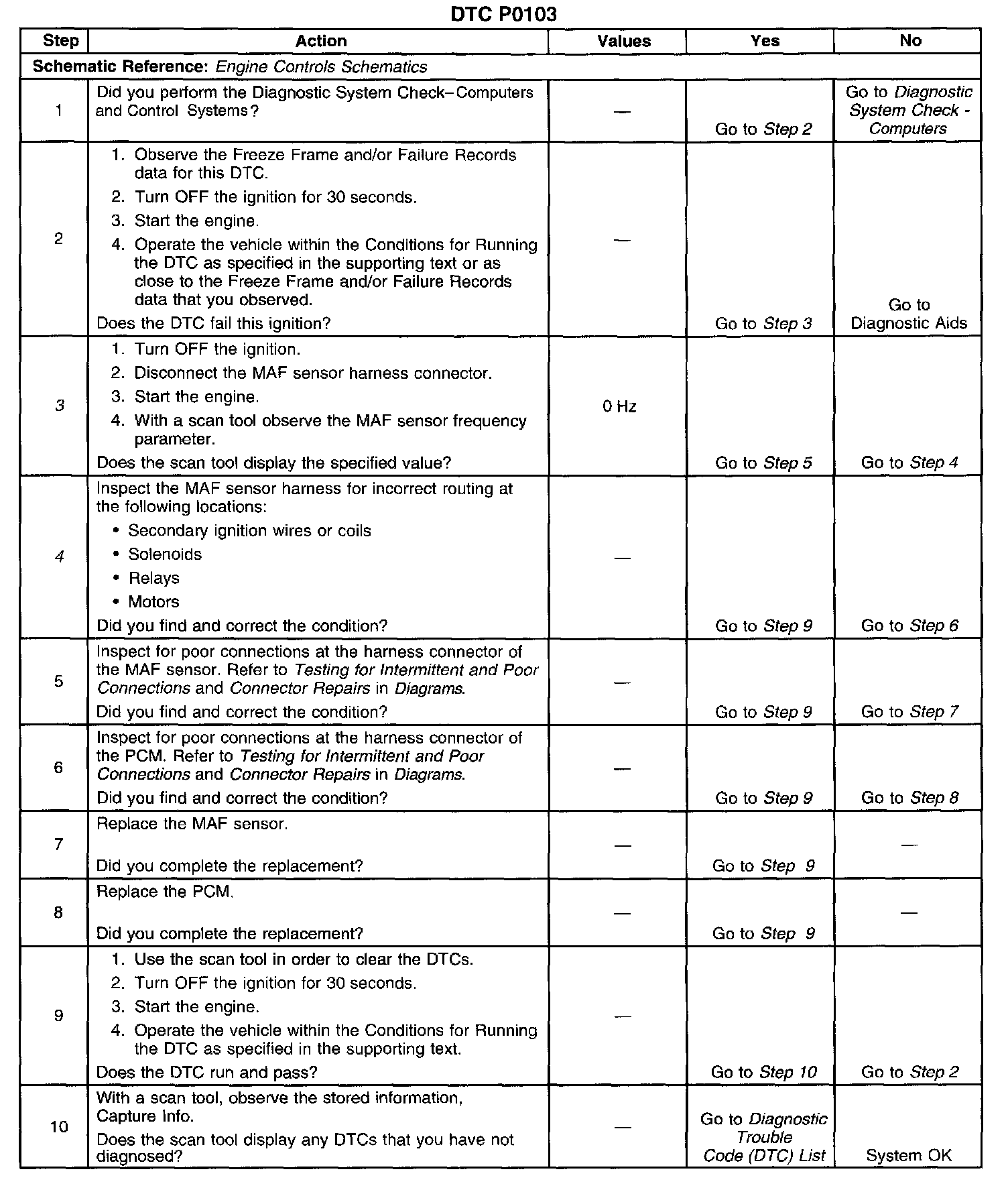 CIRCUIT DESCRIPTIONThe Mass Air Flow (MAF) sensor is an air flow meter that measures the amount of air entering the engine. The Powertrain Control Module (PCM) uses the MAF sensor frequency signal in order to provide the correct fuel delivery for a wide range of engine speeds and loads. A small quantity of air entering the engine indicates deceleration or idle. A large quantity of air entering the engine indicates an acceleration or high load situation. The MAF sensor has an ignition 1 voltage circuit, a ground circuit and a signal circuit. The PCM applies a voltage to the sensor on the signal circuit. The sensor uses the voltage in order to produce a frequency based on inlet air flow through the sensor bore. The frequency will vary within a range of around 2,000 Hertz at idle to about 10,000 Hertz at maximum engine load. DTC P0103 will set if the PCM detects a frequency signal higher than the possible range of a normally operating sensor.