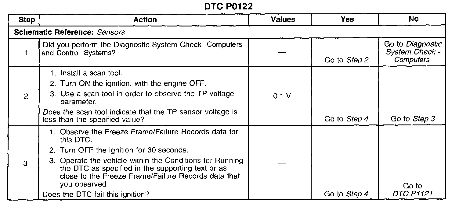 CIRCUIT DESCRIPTIONThe Throttle Position (TP) sensor is used by the Powertrain Control Module (PCM) to determine the throttle plate angle for various engine management systems. The TP sensor is a potentiometer type sensor with 3 circuits: a 5-volt reference circuit, a low reference circuit, and a signal circuit. The PCM provides the TP sensor with a 5-volt reference circuit and a low reference circuit. Rotation of the TP sensor rotor from the closed throttle position to the Wide Open Throttle (WOT) position provides the PCM with a signal voltage from less than 1 volt to greater than 4 volts through the TP sensor signal circuit. If the PCM detects an excessively low signal voltage, this DTC will set.