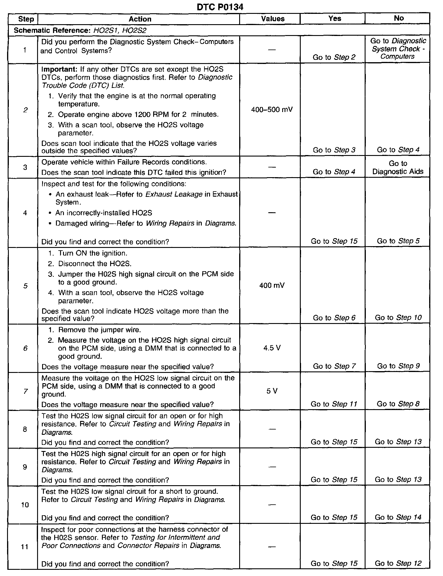 CIRCUIT DESCRIPTIONThe Powertrain Control Module (PCM) supplies a bias voltage of about 450 mV between the Heated Oxygen Sensor (HO2S) high signal and low signal circuits. When measured with a 10-megaohm DMM, this may display as low as 320 mV. The oxygen sensor varies the voltage within a range of about 1000 mV when the exhaust is rich, down through about 10 mV when exhaust is lean. The PCM constantly monitors the HO2S signal during the closed loop operation, and compensates for a rich or lean condition by decreasing or increasing the injector pulse width as necessary. If the HO2S 1 voltage remains at or near the 450 mV bias for an extended time, DTC P0134 will be set, indicating an open HO2S high signal or HO2S low signal circuit.