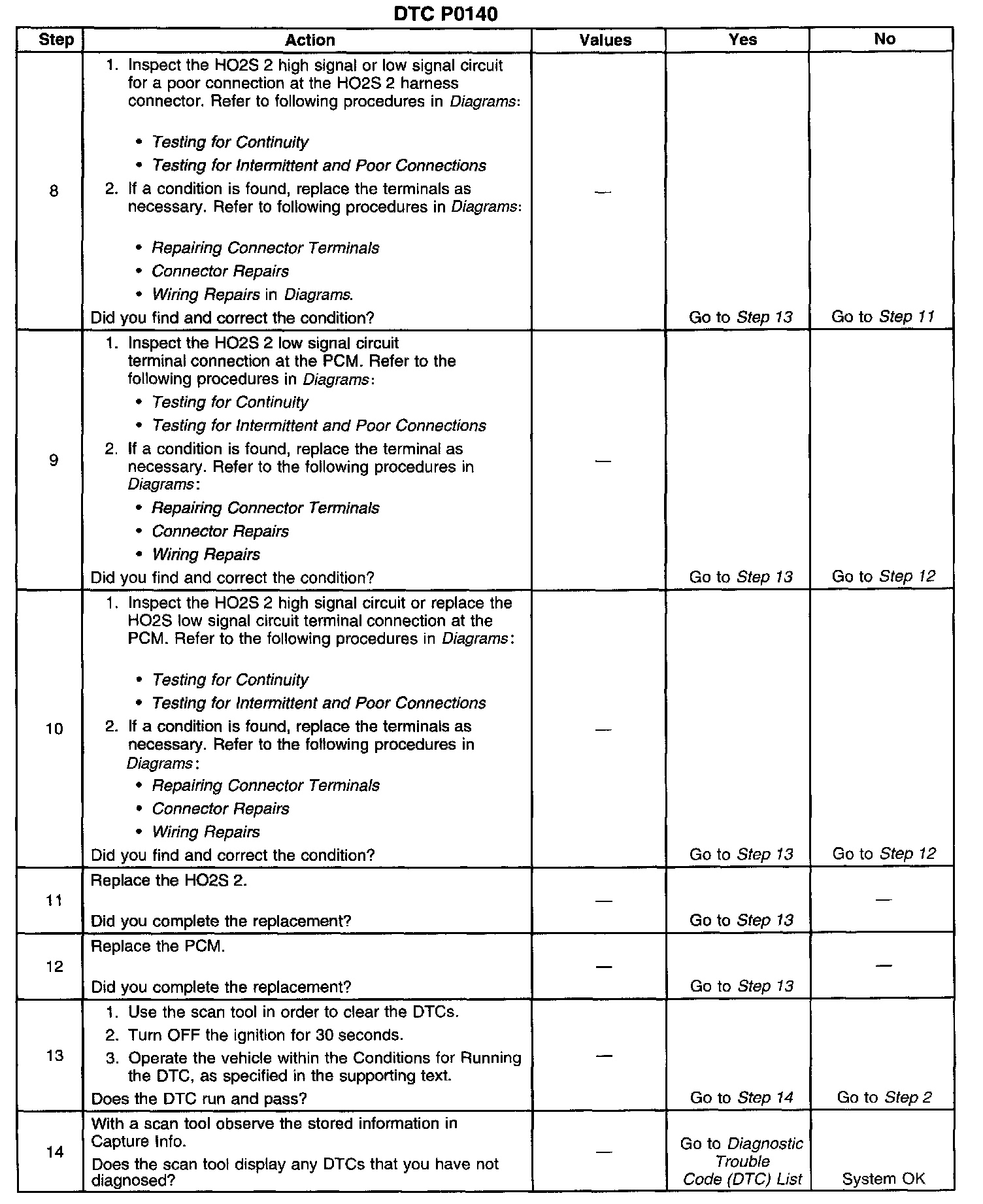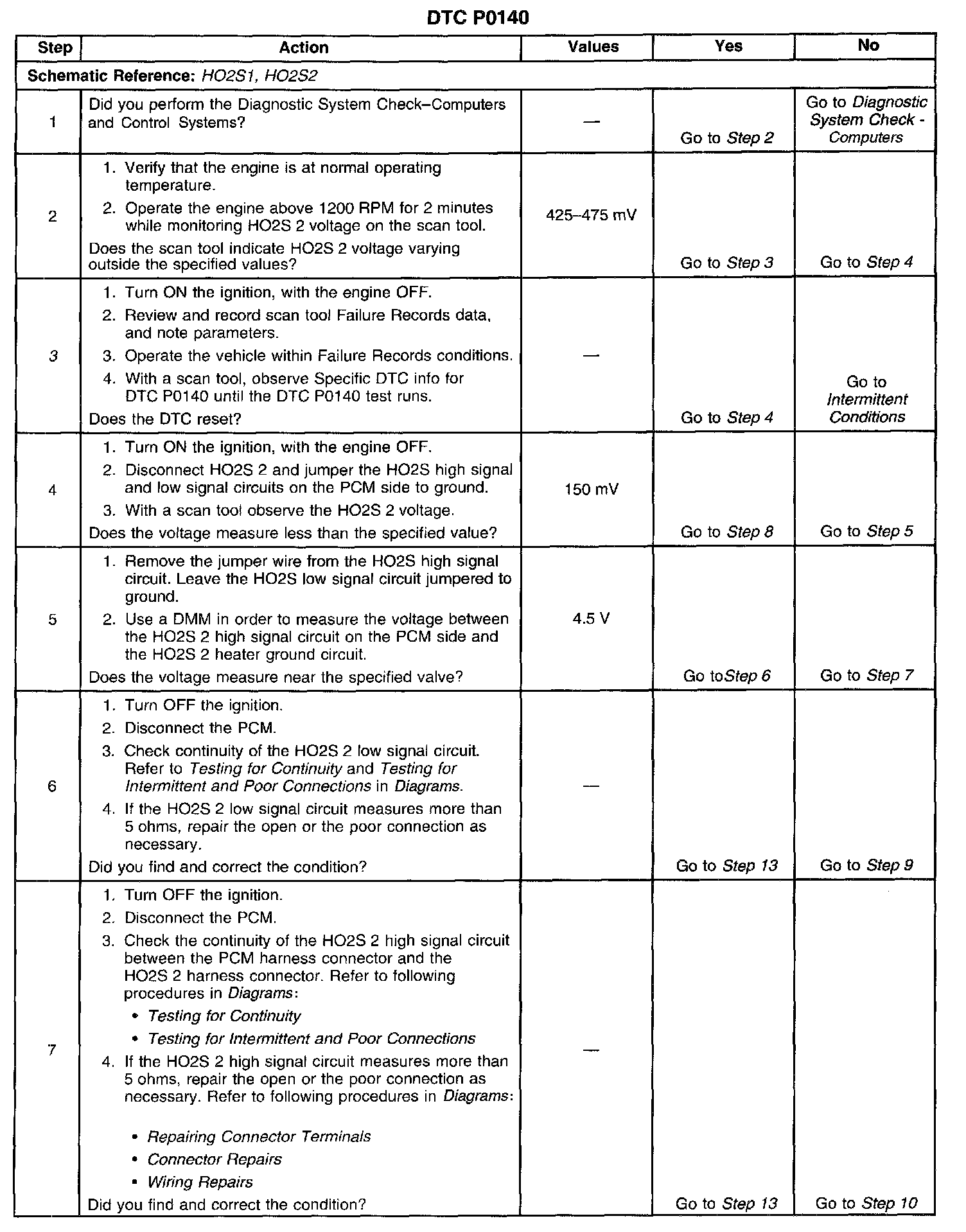 CIRCUIT DESCRIPTIONThe Powertrain Control Module (PCM) supplies a bias voltage of about 450 mV between the Heated Oxygen Sensor (HO2S) high signal and low signal circuits. When measured with a DMM, this may display as low as 320 mV. The oxygen sensor varies the voltage within a range of about 1000 mV when the exhaust is rich, down through about 10 mV when exhaust is lean. The PCM constantly monitors the HO2S signal during closed loop operation, and compensates for a rich or lean condition by decreasing or increasing the injector pulse width as necessary. If the HO2S 2 voltage remains at or near the 450 mV bias for an extended time, DTC P0140 will be set, indicating an open HO2S high signal or HO2S low signal circuit.