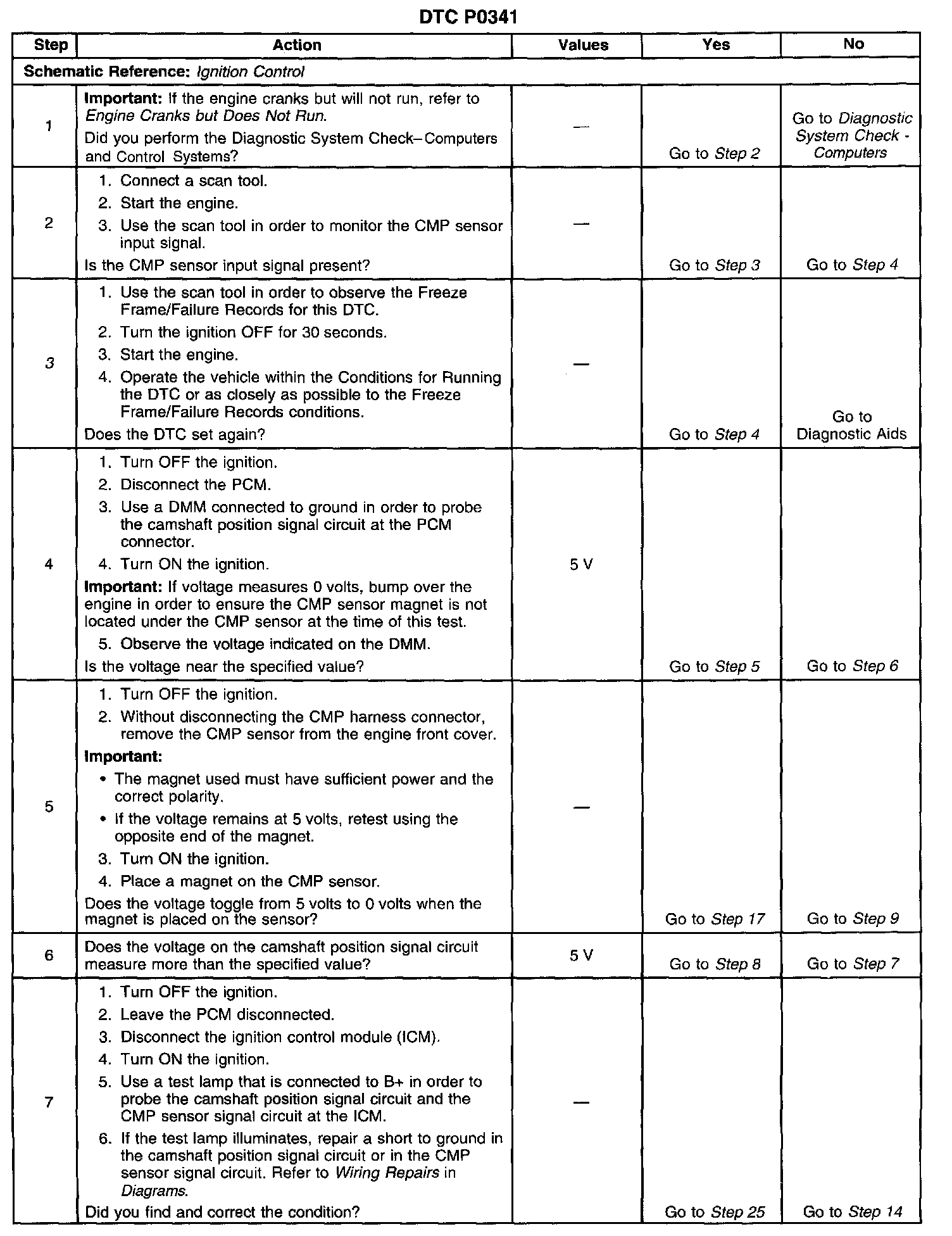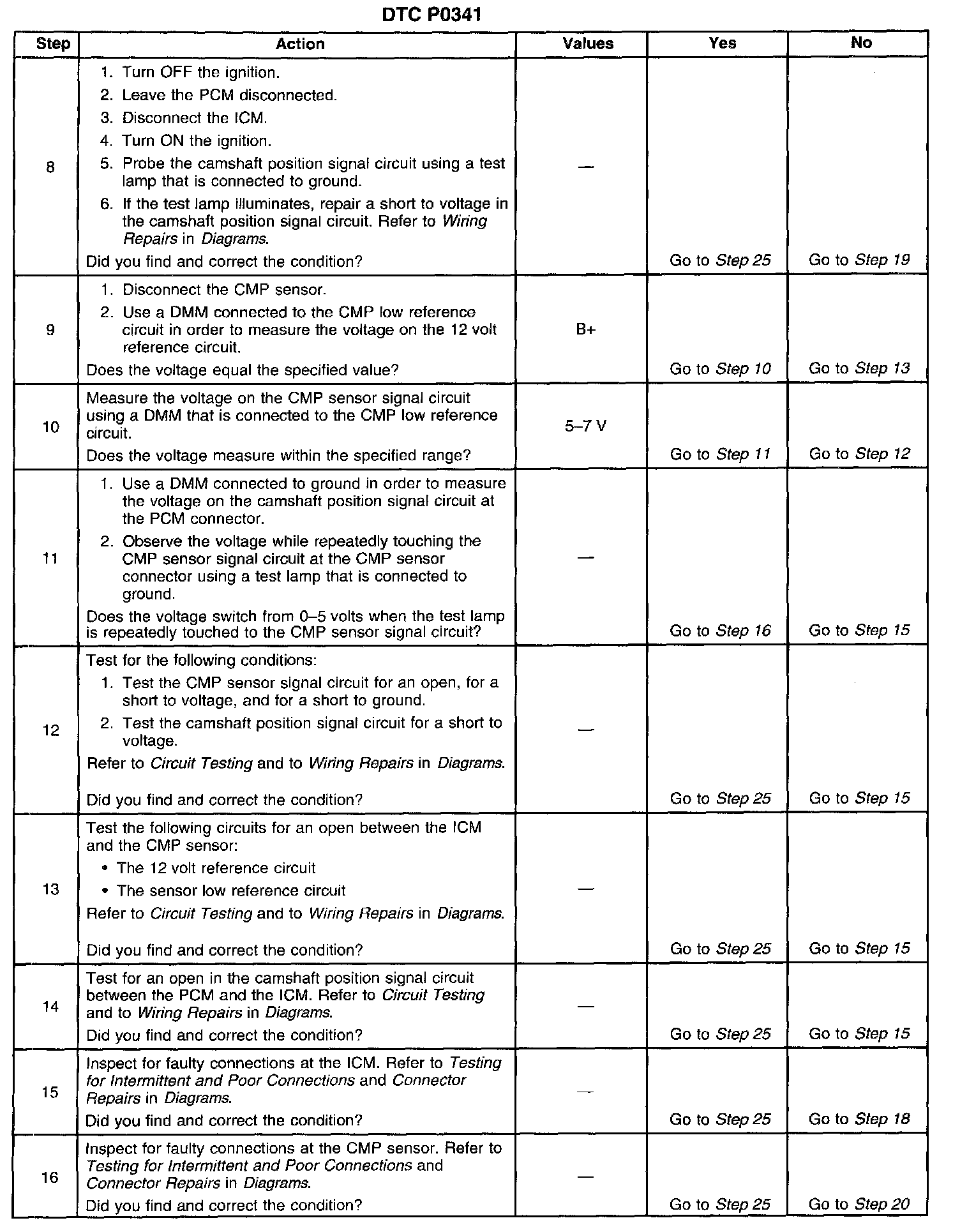 CIRCUIT DESCRIPTIONThe Camshaft Position (CMP) sensor is a hall-effect type sensor. The sensor produces one signal for each revolution of the camshaft in order to control the sequential fuel injection. There are no direct circuits to the Powertrain Control Module (PCM). All of the circuits are between the CMP sensor and the Ignition Control Module (ICM). These circuits are the CMP signal circuit, the 12-volt reference circuit, and the low reference circuit. The PCM compares the CMP sensor signal to the number of 3X, low-resolution, engine speed signals generated by the ICM. The normal ratio of 3X signals is 6-to-1. If the PCM receives an incorrect number of CMP sensor signals, this DTC sets.