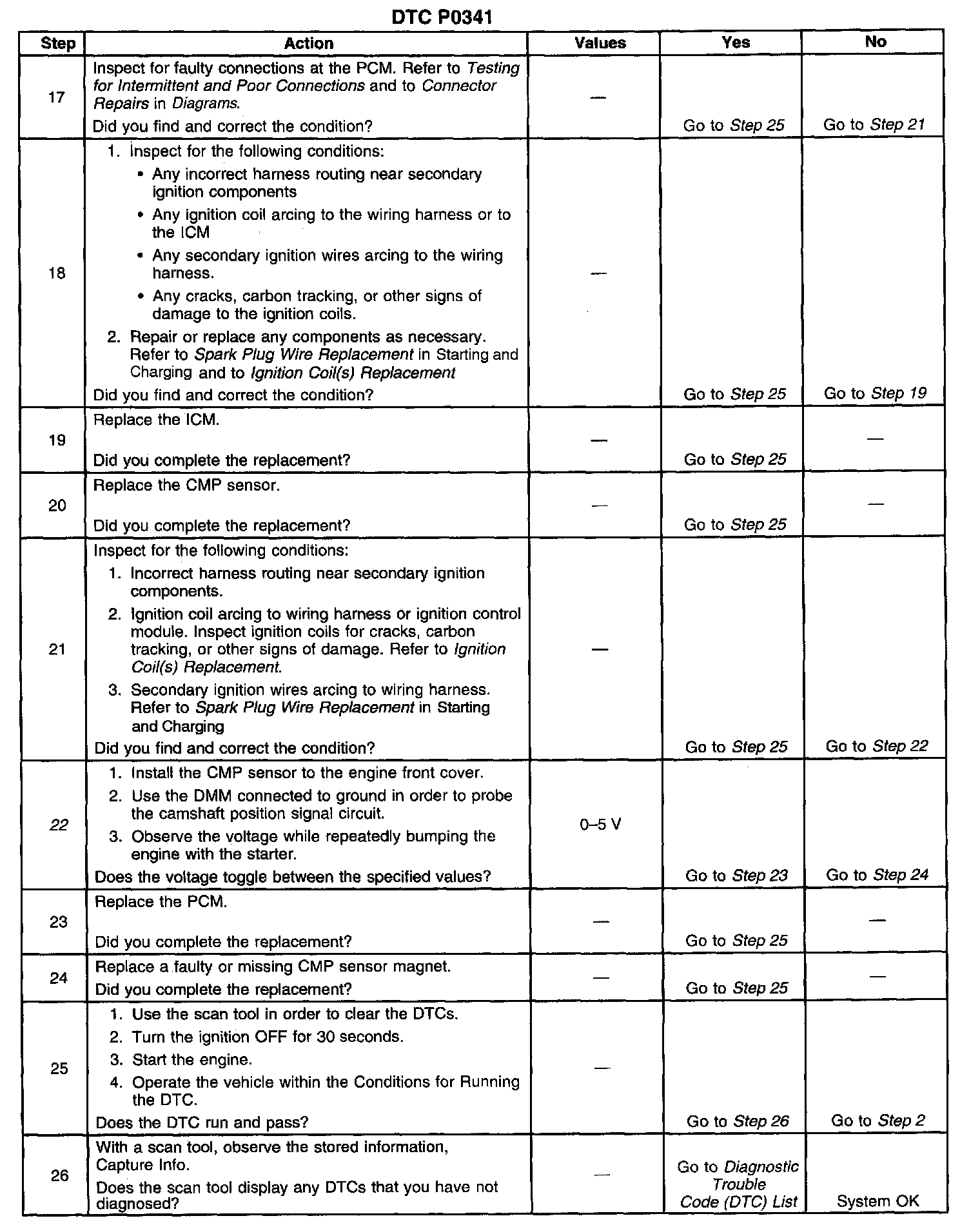 22. This step determines if the fault is caused by a missing camshaft magnet or by a faulty PCM. The voltage measured in this step should be near 4 volts, and decrease to near 0 volts when the CMP sensor interfaces with the camshaft magnet.
