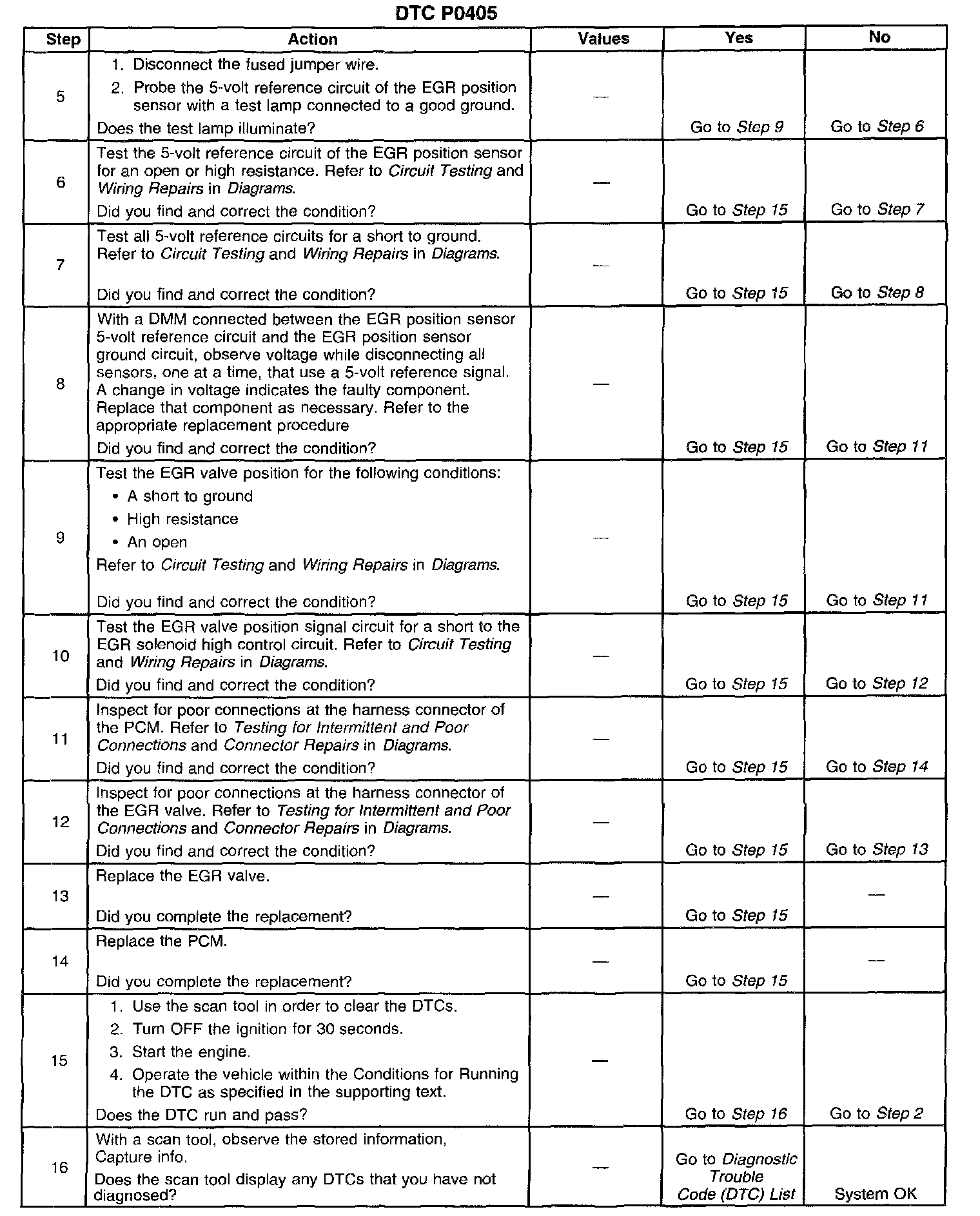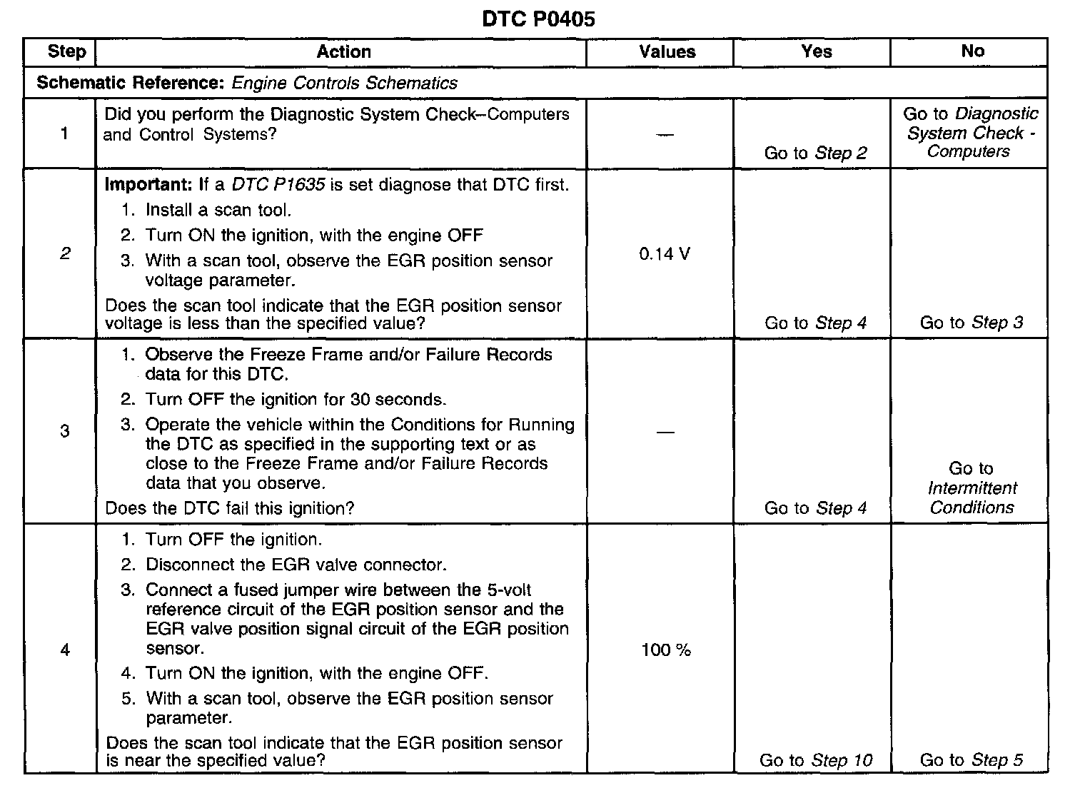 CIRCUIT DESCRIPTIONThe Powertrain Control Module (PCM) monitors the Exhaust Gas Recirculation (EGR) valve pintle position input to ensure that the valve responds properly to commands from the PCM and to detect a fault if the pintle position sensor circuit is open or shorted. If the PCM detect an excessively low EGR position sensor signal voltage this DTC will set.