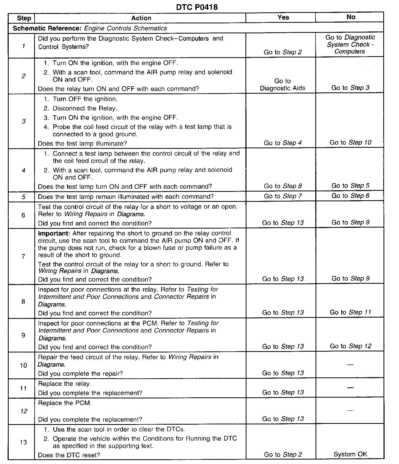 CIRCUIT DESCRIPTIONIgnition voltage is supplied directly to the secondary Air Injection (AIR) pump relay. The Powertrain Control Module (PCM) controls the relay by grounding the control circuit via an internal solid state device called a driver. The primary function of the driver is to supply the ground for the component being controlled. Each driver has a fault line which is monitored by the PCM. When the PCM is commanding a component ON, the voltage of the control circuit should be low, near 0 volts. When the PCM is commanding the control circuit to a component OFF, the voltage potential of the circuit should be high, near battery voltage. If the fault detection circuit senses a voltage other than what is expected, this DTC will set.