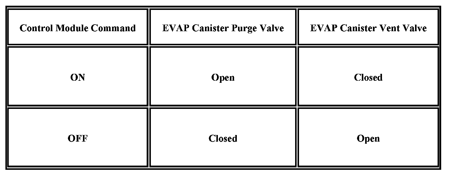 The following table illustrates the relationship between the ON and OFF states, and the OPEN or CLOSED states of the EVAP canister purge and vent valves.
