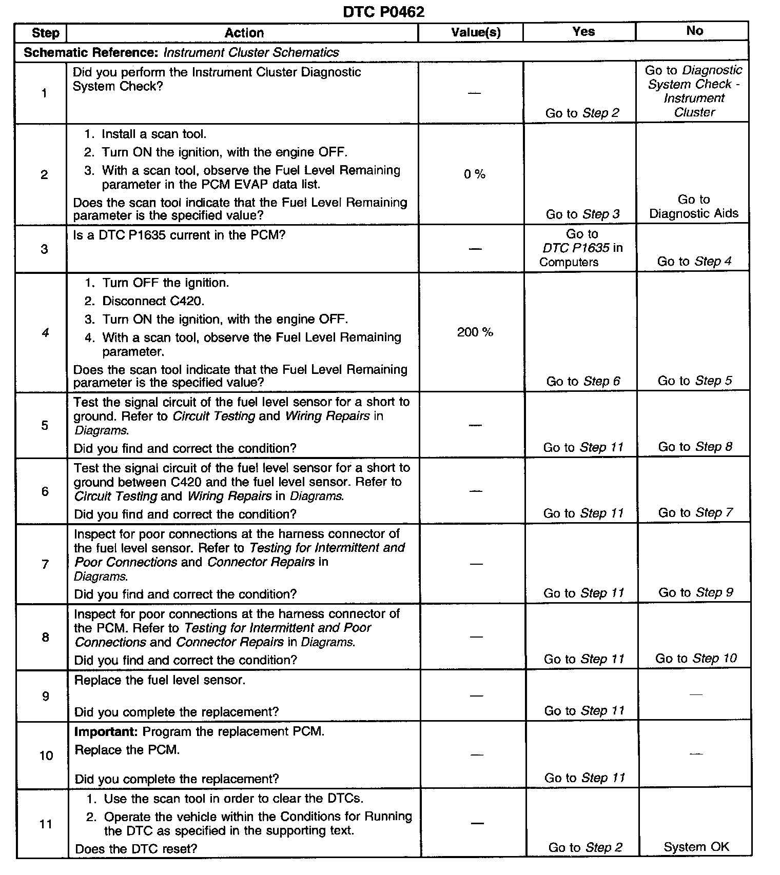 CIRCUIT DESCRIPTIONThe fuel level sensor changes resistance based on fuel level. The PCM monitors the signal circuit of the fuel level sensor in order to determine fuel level. When the fuel tank is full, the sensor resistance is high and the PCM senses a high signal voltage. When the fuel tank is empty, the sensor resistance is low and the PCM senses a low signal voltage. The PCM uses the signal circuit of the fuel level sensor in order to calculate the total remaining fuel (%) in the tank. The PCM sends the fuel level percent via the class 2 serial data circuit to the instrument cluster in order to control the fuel gauge. The fuel level information is also used for misfire and EVAP diagnostics.