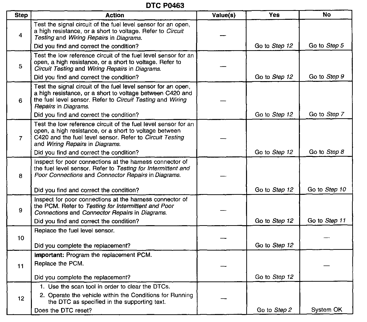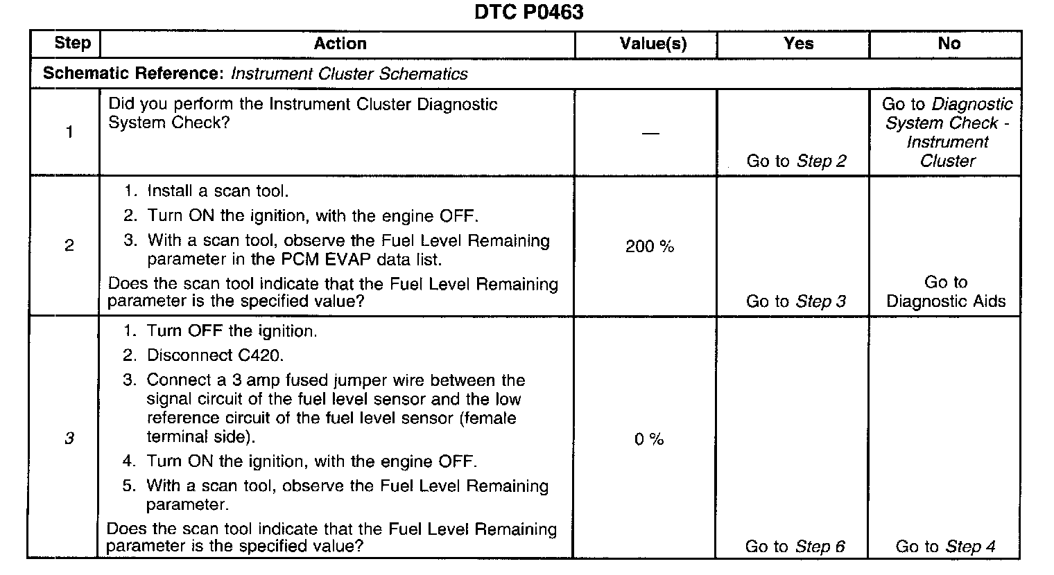 CIRCUIT DESCRIPTIONThe fuel level sensor changes resistance based on fuel level. The PCM monitors the signal circuit of the fuel level sensor in order to determine fuel level. When the fuel tank is full, the sensor resistance is high and the PCM senses a high signal voltage. When the fuel tank is empty, the sensor resistance is low and the PCM senses a low signal voltage. The PCM uses the signal circuit of the fuel level sensor in order to calculate the total remaining fuel (%) in the tank. The PCM sends the fuel level percent via the class 2 serial data circuit to the instrument cluster in order to control the fuel gauge. The fuel level information is also used for misfire and EVAP diagnostics.