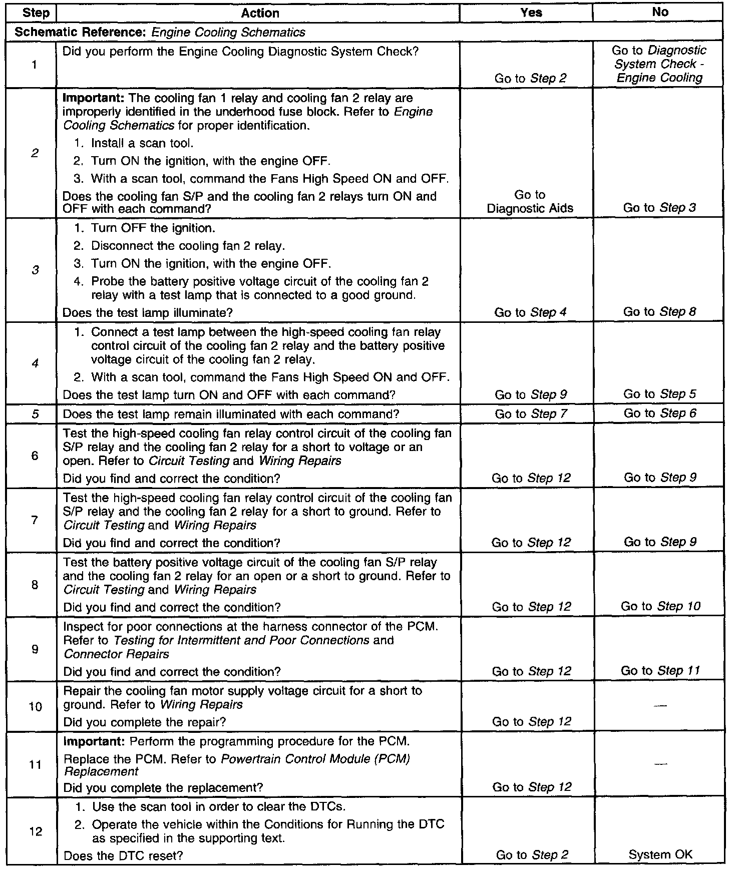 Battery positive voltage is supplied to the cooling fan S/P relay and the cooling fan 2 relay from the cool fan 2 fuse. The Powertrain Control Module (PCM) controls the relays by grounding the high speed cooling fan relay control circuit via an internal solid state device called a driver. The primary function of the driver is to supply the ground for the component being controlled. Each driver has a fault line which is monitored by the PCM. When the PCM is commanding a component on, the voltage potential of the control circuit should be low (near 0 volts). When the PCM is commanding the control circuit to a component off, the voltage potential of the circuit should be high (near battery voltage). If the fault detection circuit senses a voltage other than what is expected, the DTC will set.